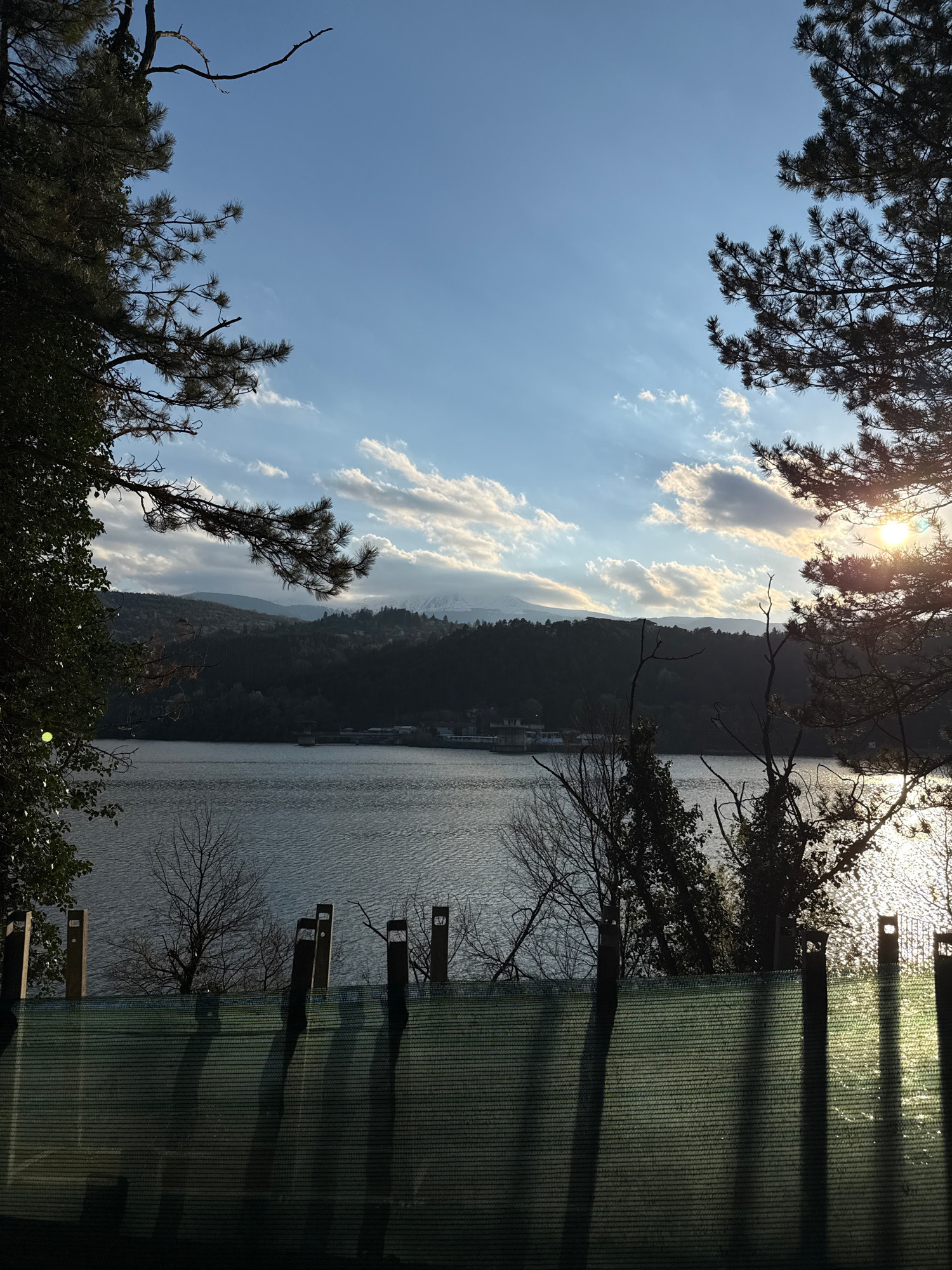 The image shows a lake surrounded by forested hills, viewed from a partially obstructed vantage point. The sky is blue with scattered white clouds, and the sun is visible near the top of the frame. Tr…read more