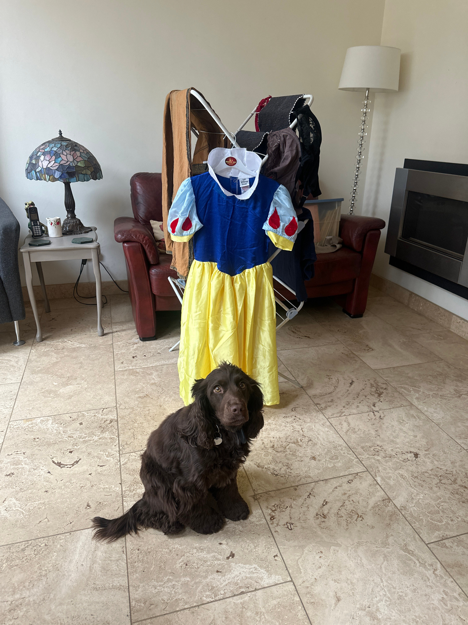 A medium-sized brown spaniel-type dog is seated on a light-colored tile floor. Beside the dog is a garment rack holding various items, including a Snow White costume. The scene is indoors, in a reside…read more