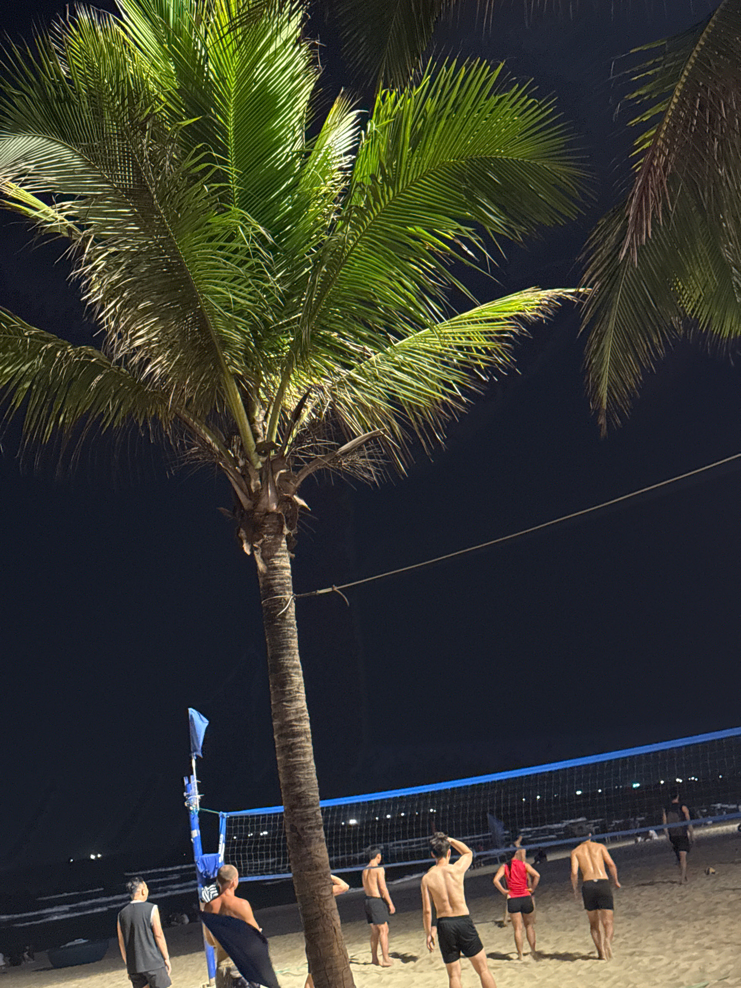 At night in Đà Nẵng, Vietnam, under the illumination of artificial lighting, a palm tree is prominently featured. Its green fronds contrast against the dark sky. In the background, a volleyball net is…read more