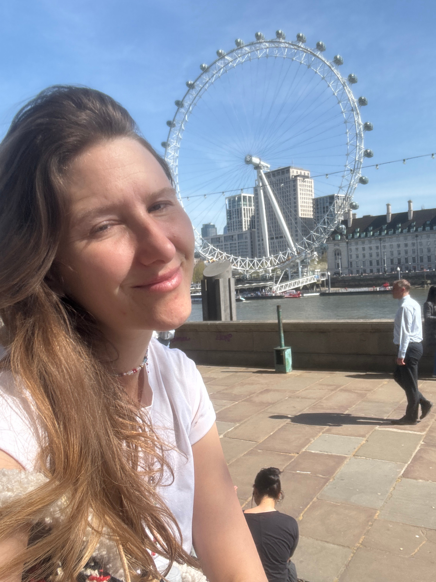 The image shows a selfie of a person with long brown hair. The person is wearing a white shirt and a colorful beaded necklace. In the background, the London Eye is visible, along with the buildings on…read more