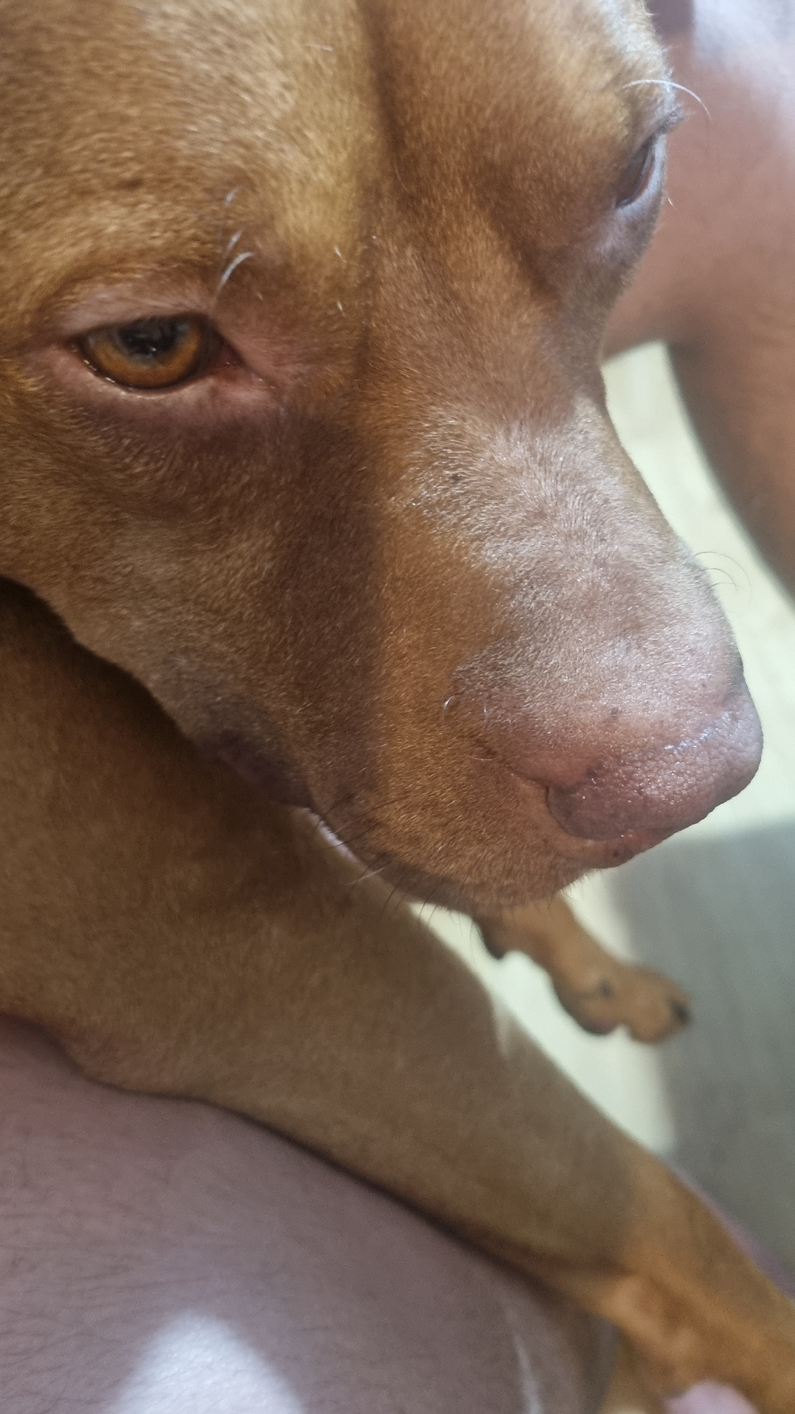 A close-up shot features the head and part of the body of a brown dog. The dog's head is positioned toward the left side of the frame, with its brown eye partially visible. The dog's nose is prominent…read more