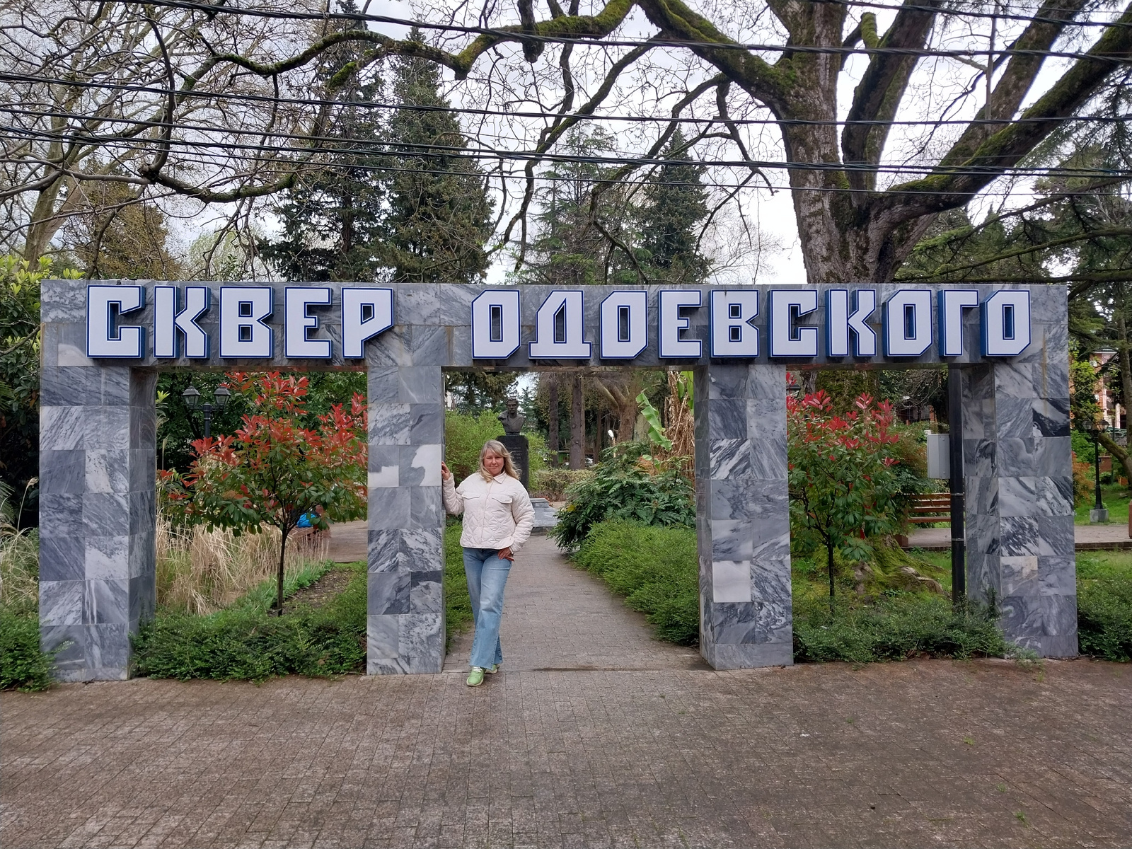 A full, eye-level outdoor shot shows a woman standing in the center of a walkway that leads through a park entrance marked by large, gray stone pillars and the inscription "СКВЕР ОДОЕВСКОГО" in large…read more