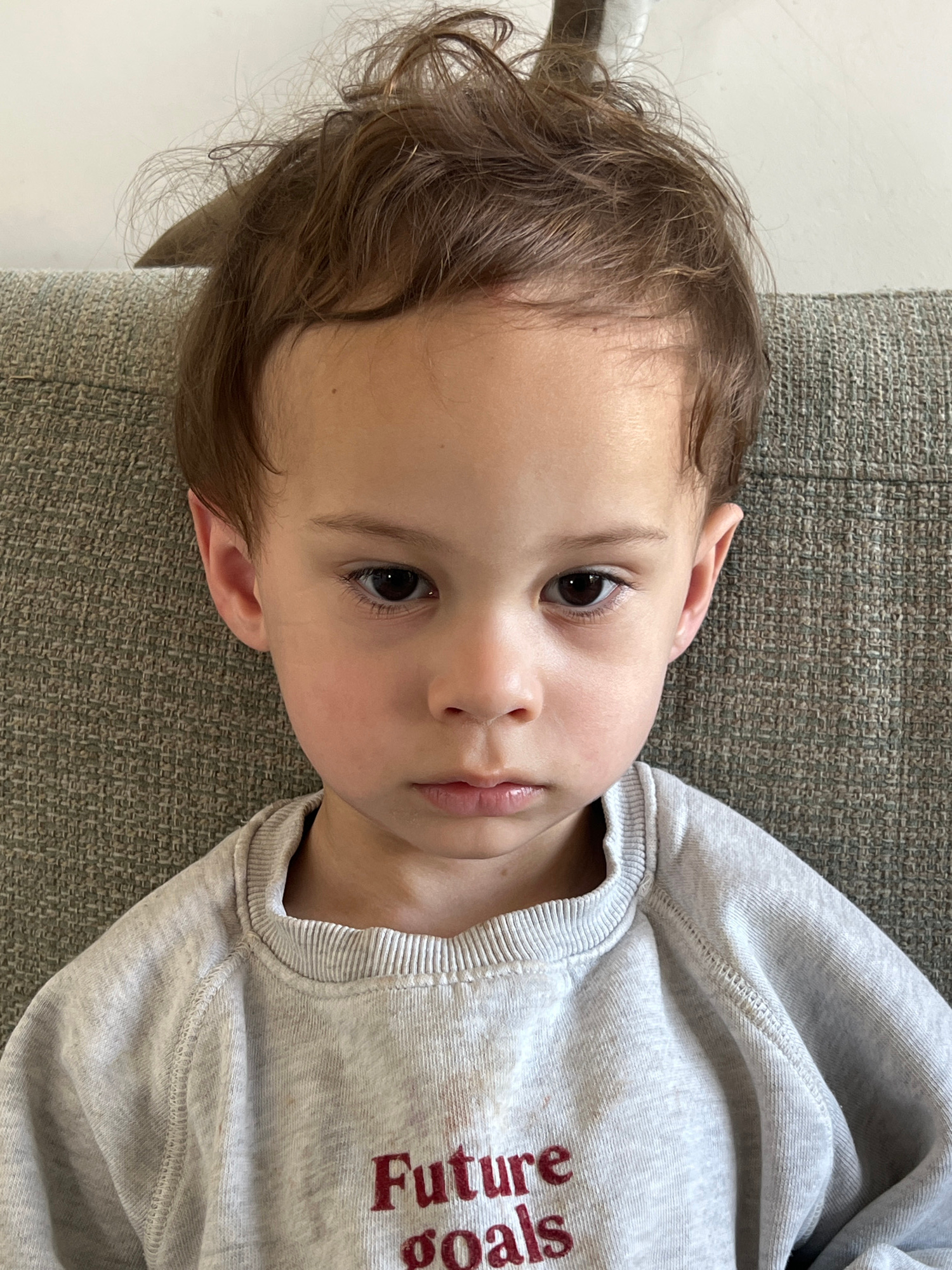 A young child is lying on a grey couch. The child has brown hair and eyes, and is wearing a grey sweatshirt with the words "Future Goals" in burgundy lettering. The child's head is tilted to the side,…read more