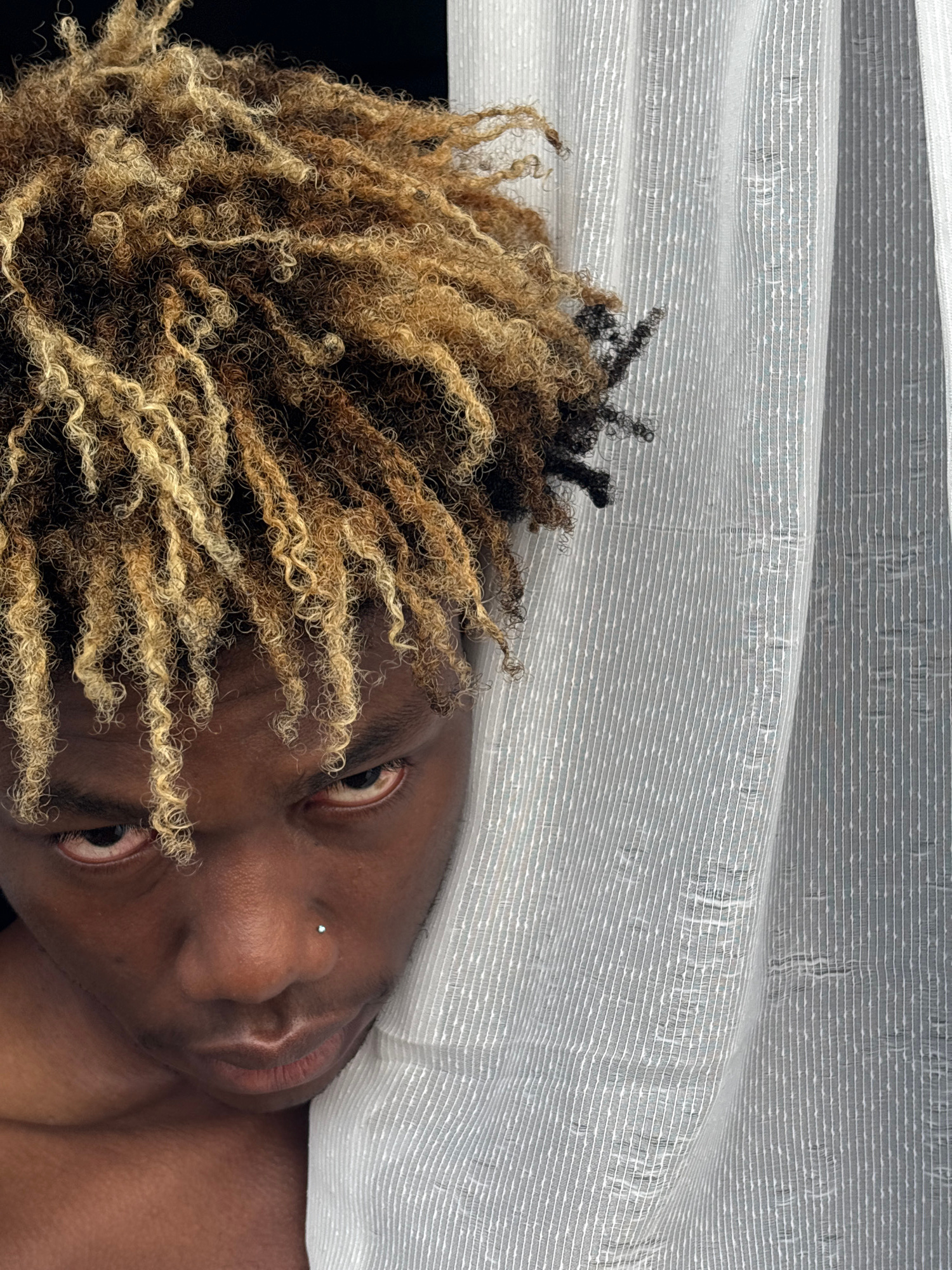A close-up portrait features a person with dark skin, positioned at an angle against a light, textured fabric background. The person's head is tilted, with their gaze directed towards the viewer. Theiβ¦read more