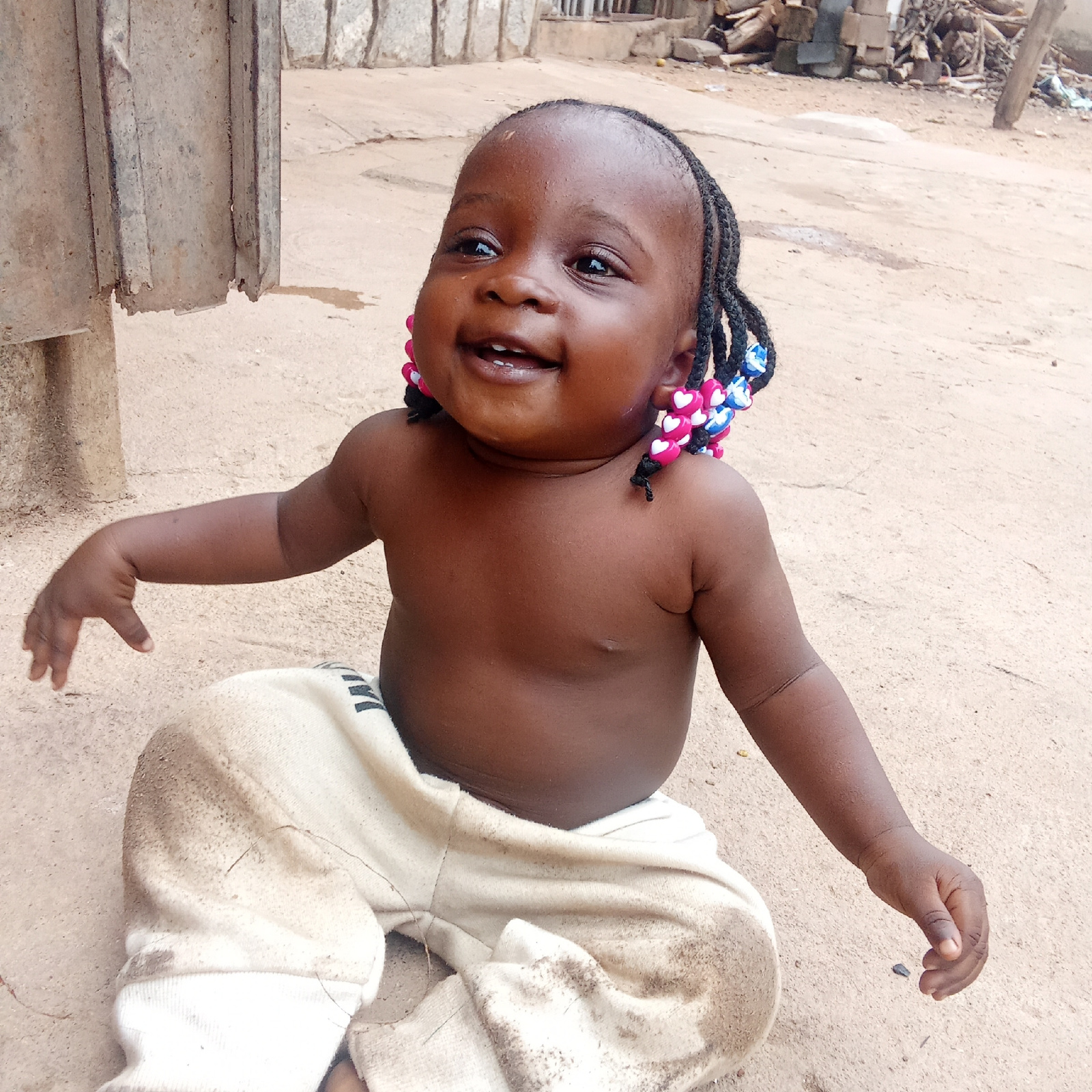 A young child sits cross-legged on a dirt ground in what appears to be a residential area in Akwanga, Nigeria. The child has dark skin, braids adorned with pink and blue beads, and is wearing light-co…read more