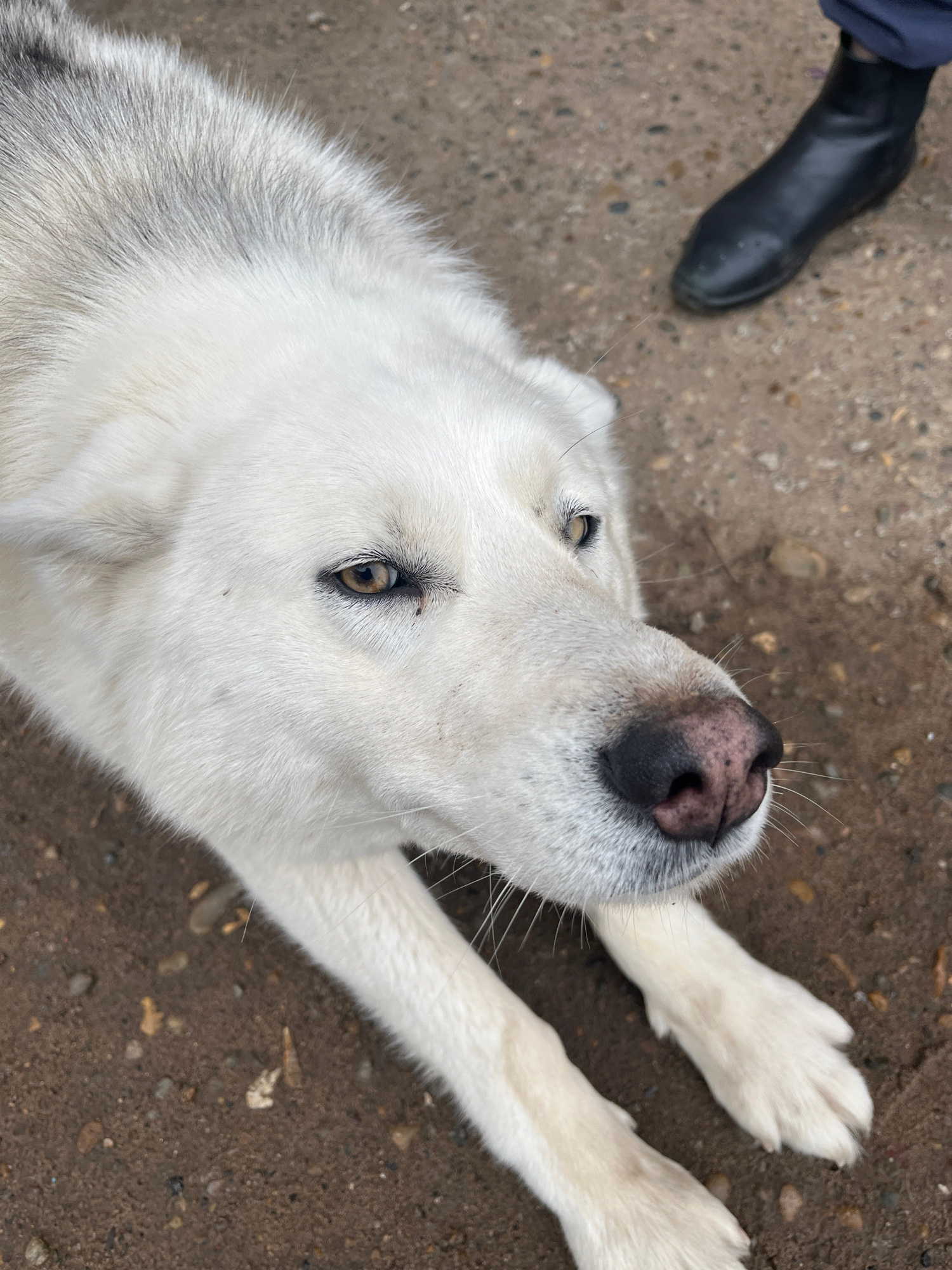 A close-up, high-angle shot shows a white and gray dog lying on a dirt surface. The dog's face, with a large black and pink nose, is in focus. Its paws are extended towards the upper right of the fram…read more