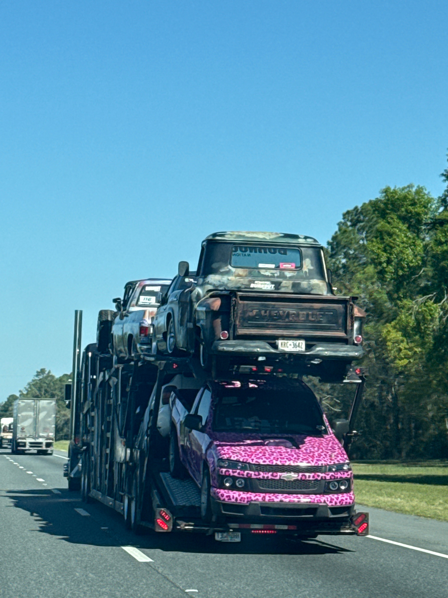 The image displays a multi-car carrier truck transporting several customized pickup trucks on a multi-lane highway near White Springs, United States. The sky is clear and blue, and the road is flankedβ¦read more