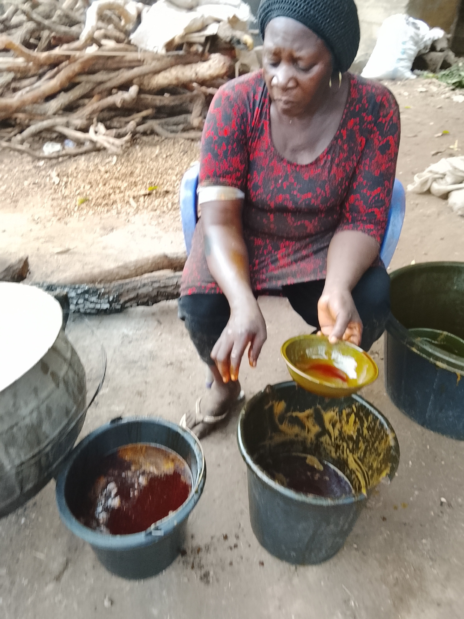 A woman in a black headscarf and red patterned shirt is sitting on a blue plastic chair outdoors. She holds a yellow bowl filled with a red liquid in her right hand and her right hand is stained with…read more
