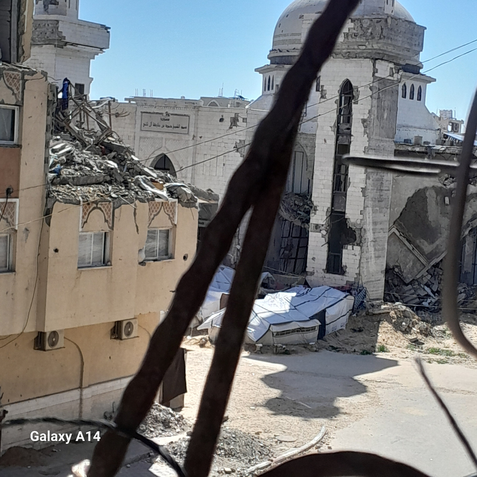 This image presents a scene of extensive urban destruction in Khan Yunis, Palestinian Territory, under a clear blue sky. The foreground is partially obscured by blurred, dark, elongated structural eleβ¦read more