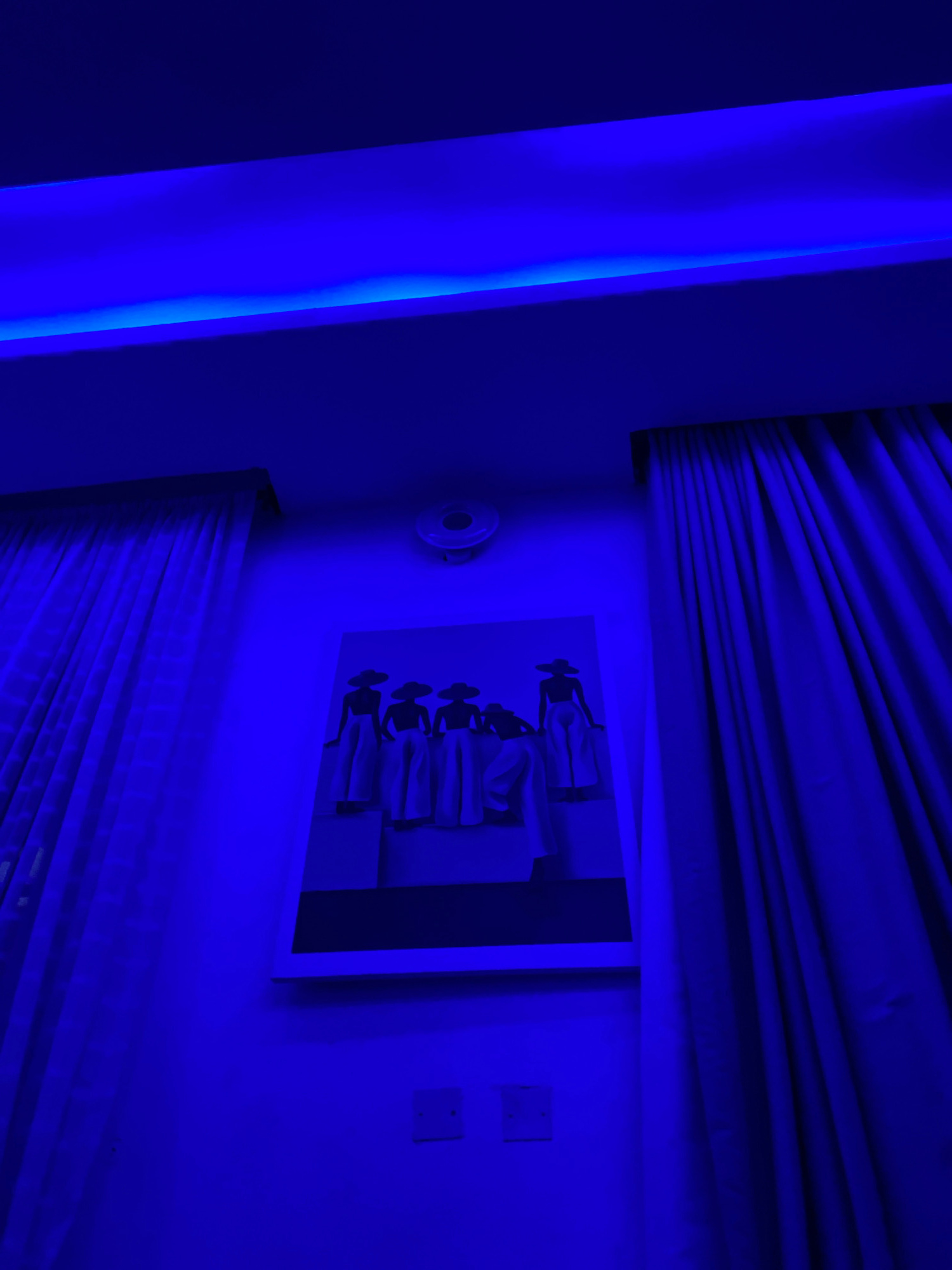 The image is an interior shot under strong blue lighting. The scene includes a section of a wall with a rectangular framed picture depicting silhouettes of people wearing hats and coats. There is also…read more
