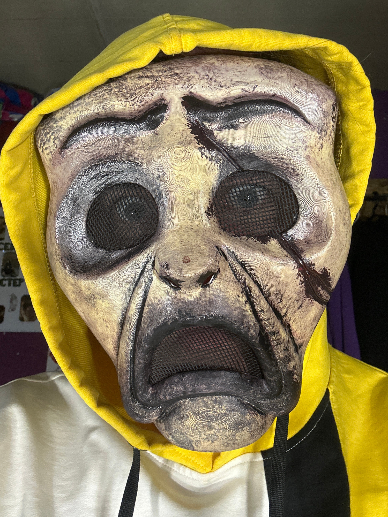 A close-up, high-angle shot captures a stylized, eerie mask partially nestled within a bright yellow hood. The mask, appearing to be made of a rigid, textured material, possibly 3D printed given the v…read more