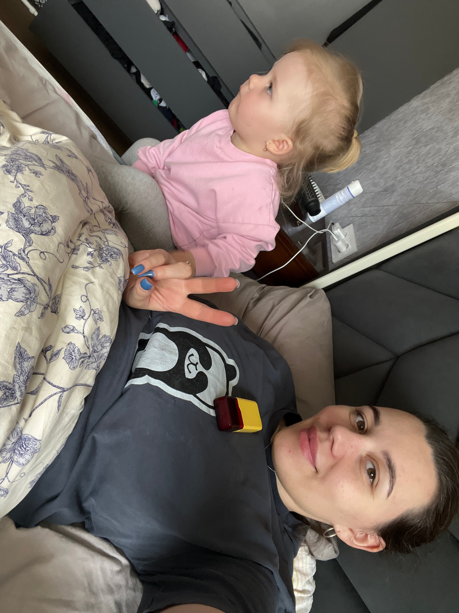 A selfie depicts a woman lying in bed with a young child next to her. The woman, fair-skinned with dark hair pulled back, is wearing a dark grey t-shirt featuring a panda design. She holds up her hand…read more