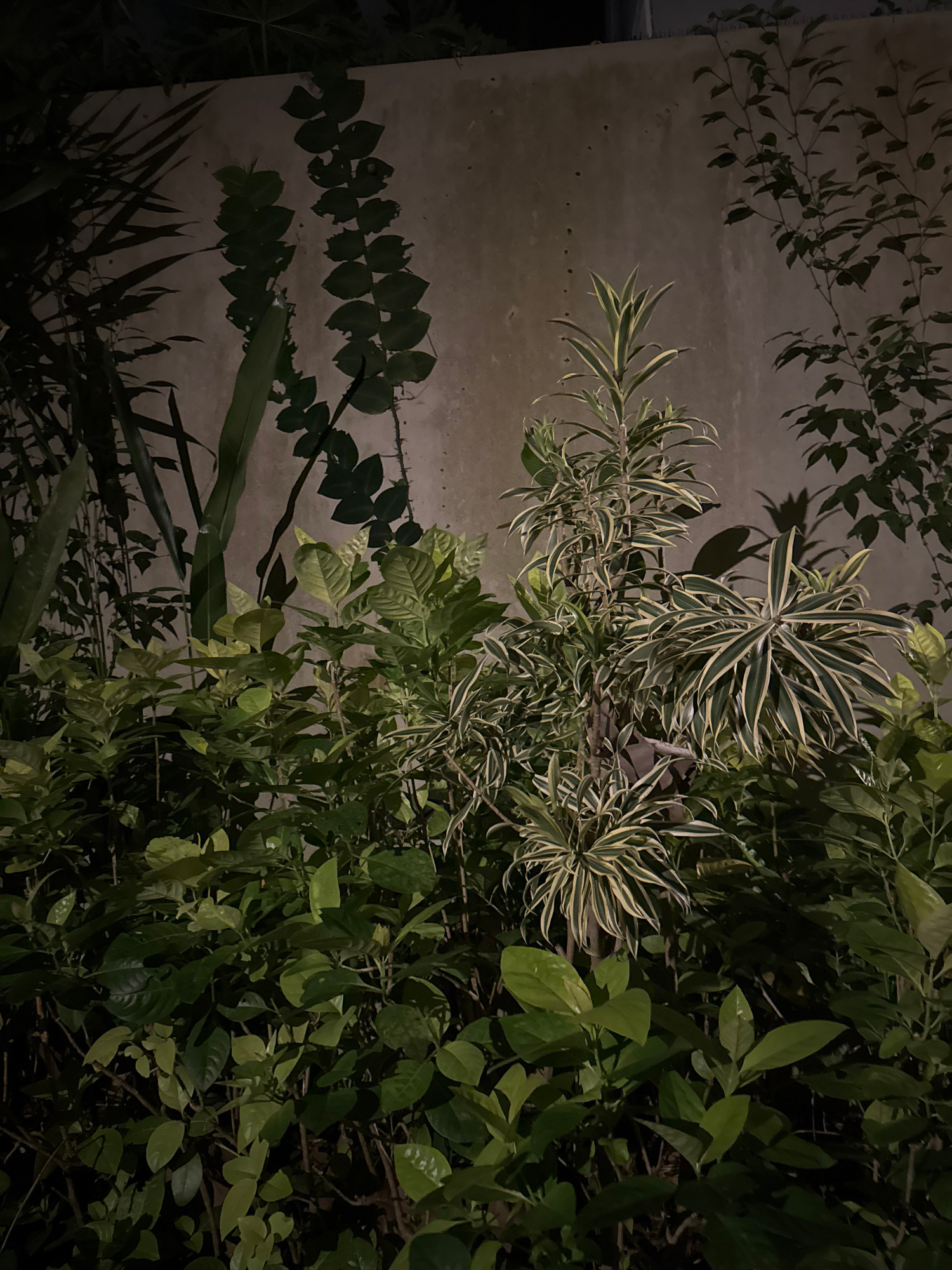 The image shows a variety of plants growing against a textured wall. Some of the plants have light green and white striped leaves. Other plants have solid green leaves. The leaves and branches cast sh…read more