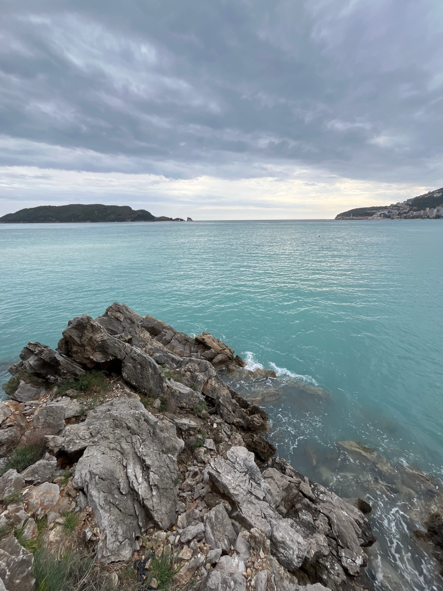 A landscape scene shows a rocky shoreline abutting the turquoise sea under a cloudy sky. The rocky area is in the lower right of the frame, with craggy grey rocks and some sparse vegetation. The sea s…read more