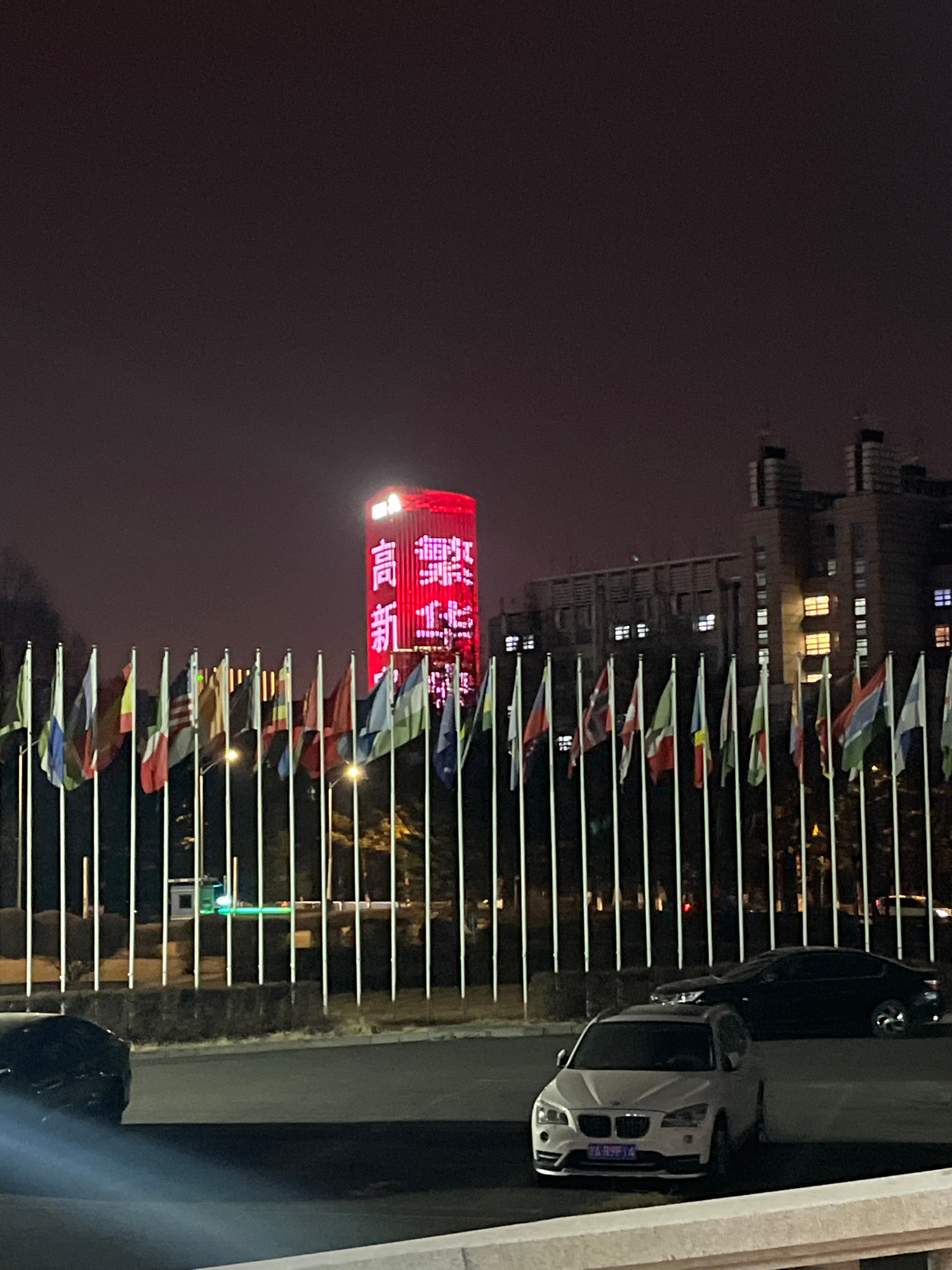 The image depicts a nighttime scene in Changchun City, China. A brightly lit red tower, displaying Chinese characters vertically, dominates the left side of the frame. Rows of international flags on pā¦read more