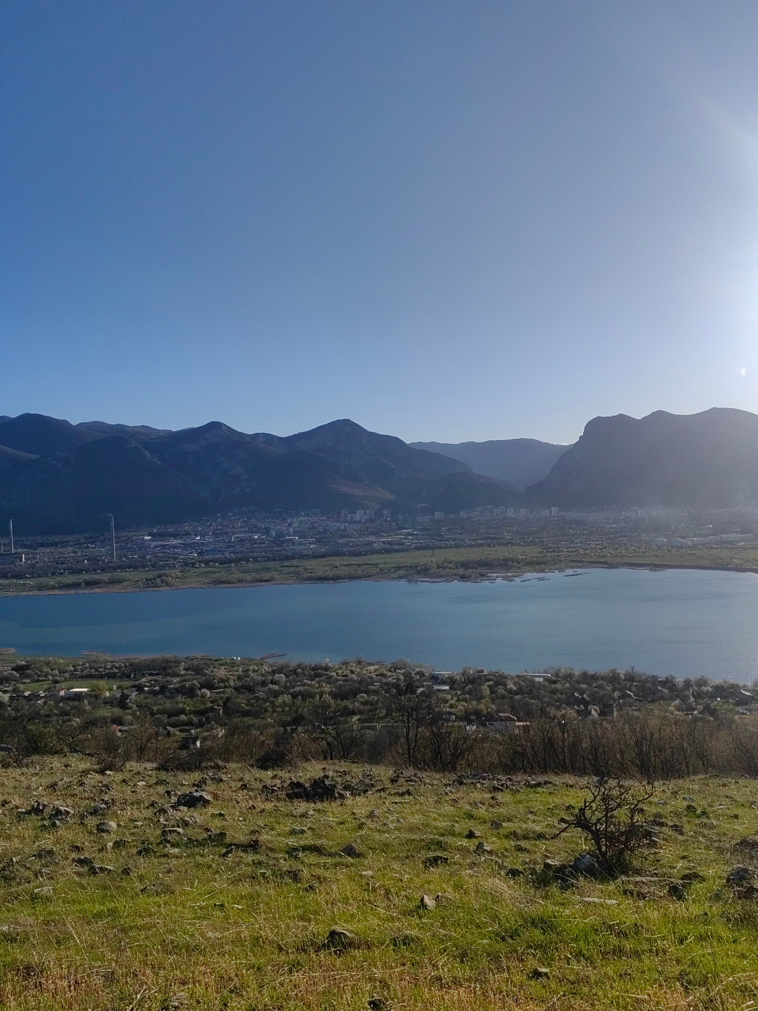 A landscape view shows a lake in the foreground, a town in the midground, and mountains in the background under a clear blue sky. The foreground consists of a grassy hillside with scattered rocks and…read more