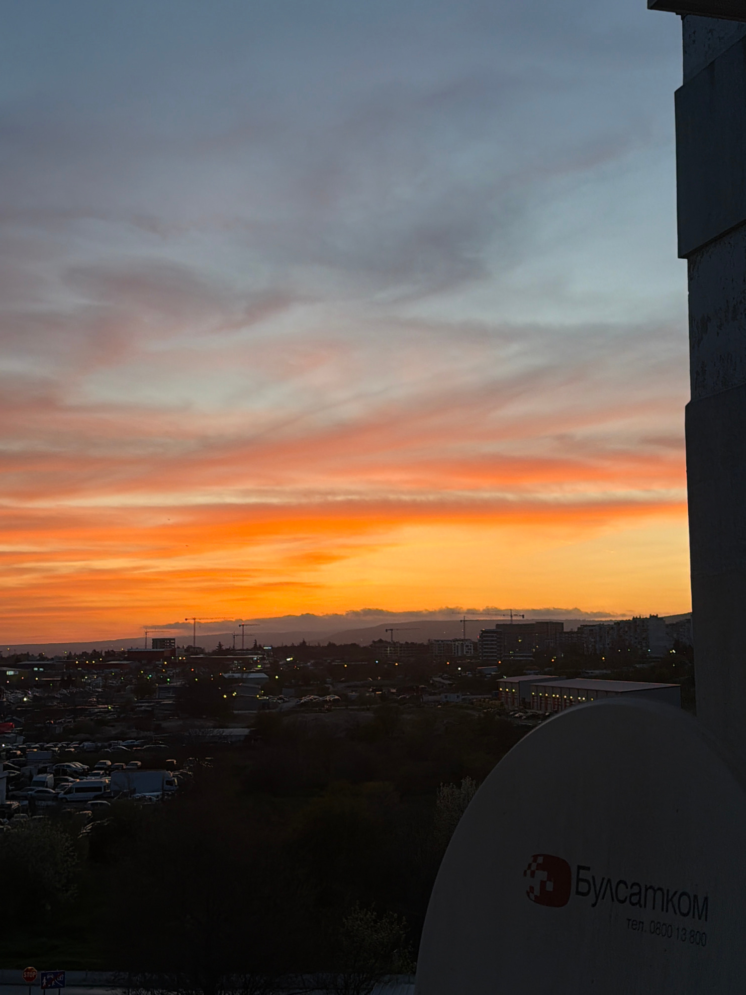 This media file captures an urban landscape at either sunrise or sunset, dominated by a vibrant, colorful sky. The image is taken from a slightly elevated position, looking out over a city towards a d…read more
