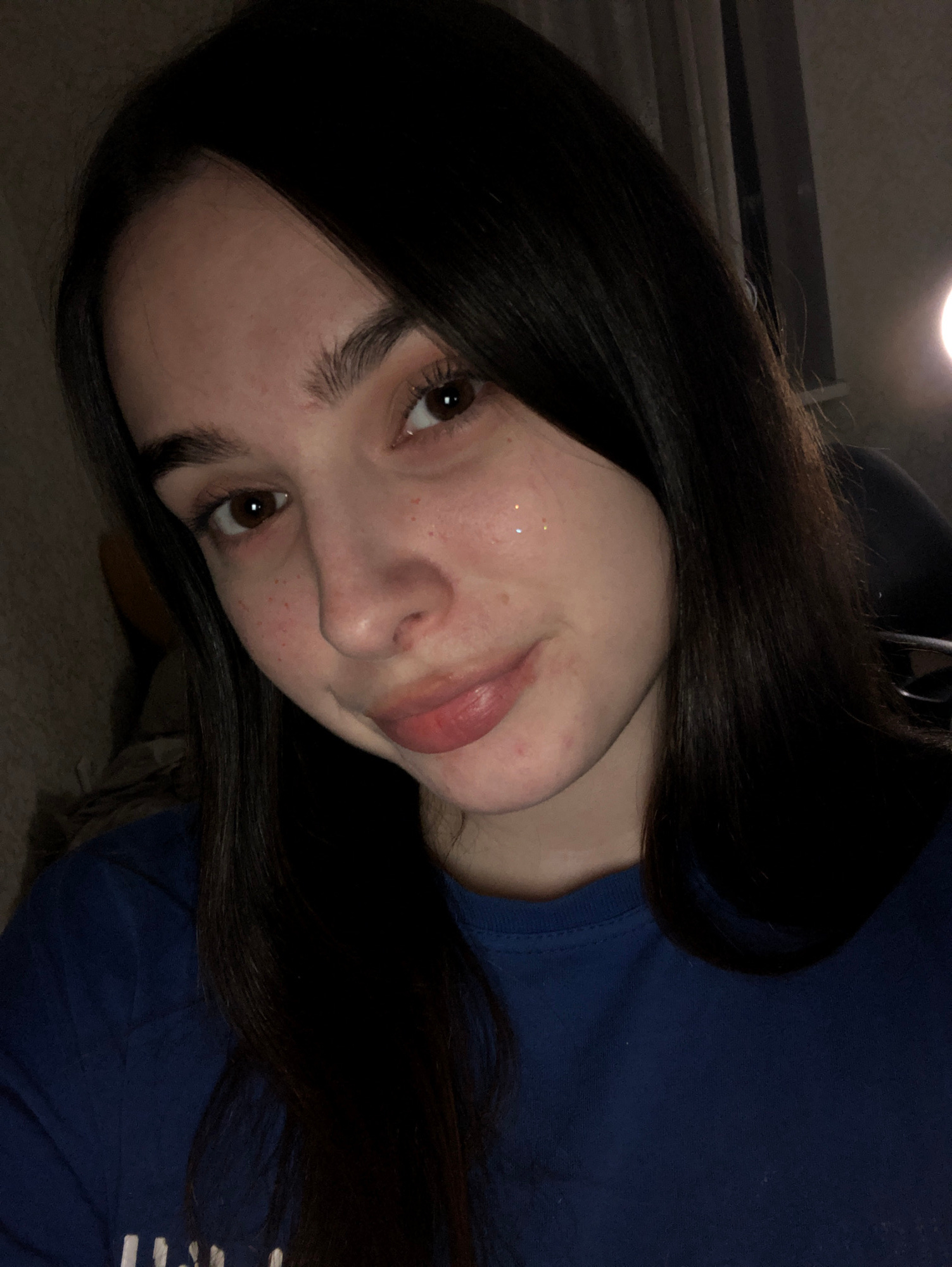 A young woman with dark hair and brown eyes is looking upwards. She has fair skin with freckles. She is wearing a dark blue t-shirt. The background is indistinct, but suggests an indoor setting with a…read more