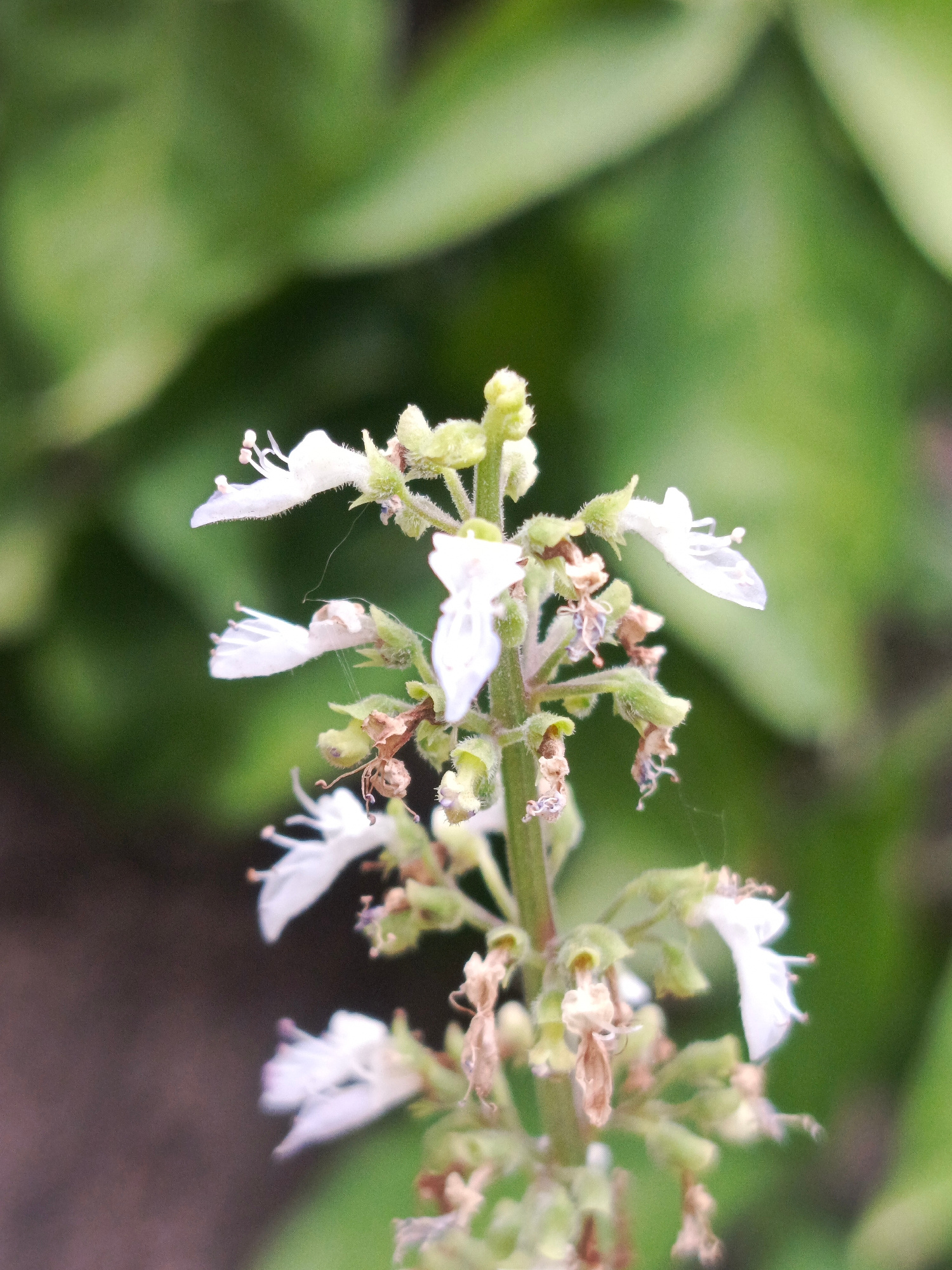 A close-up shot features a flowering plant, likely a basil plant, in bloom. The plant exhibits a vertical stem with small, white flowers clustered along its length. Some flowers are in full bloom, whi…read more