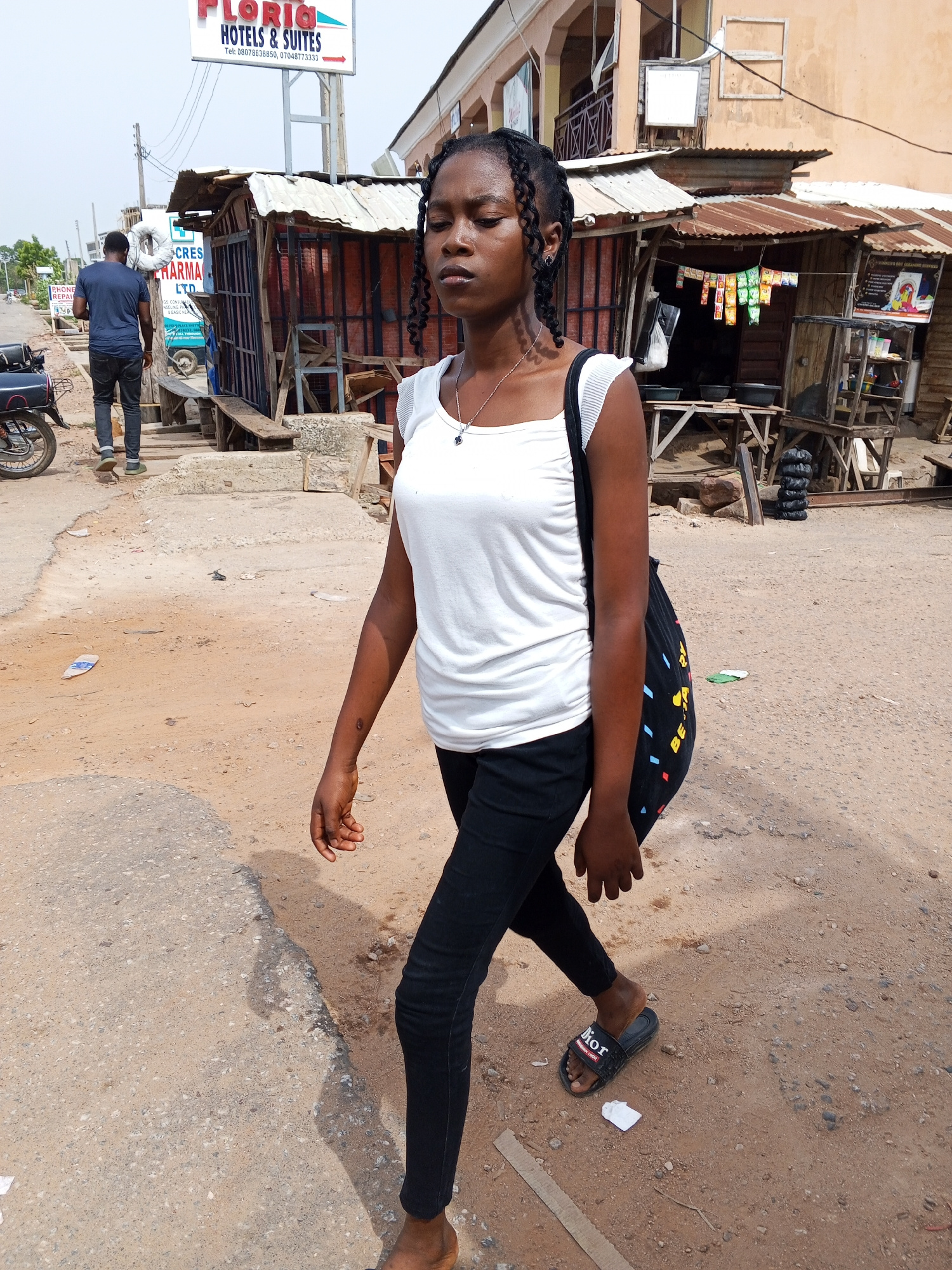 A young, dark-skinned woman is walking toward the camera in Adankolo, Nigeria. She wears a white top, black pants, and Dior-branded slide sandals. A black shoulder bag hangs from her left shoulder. He…read more
