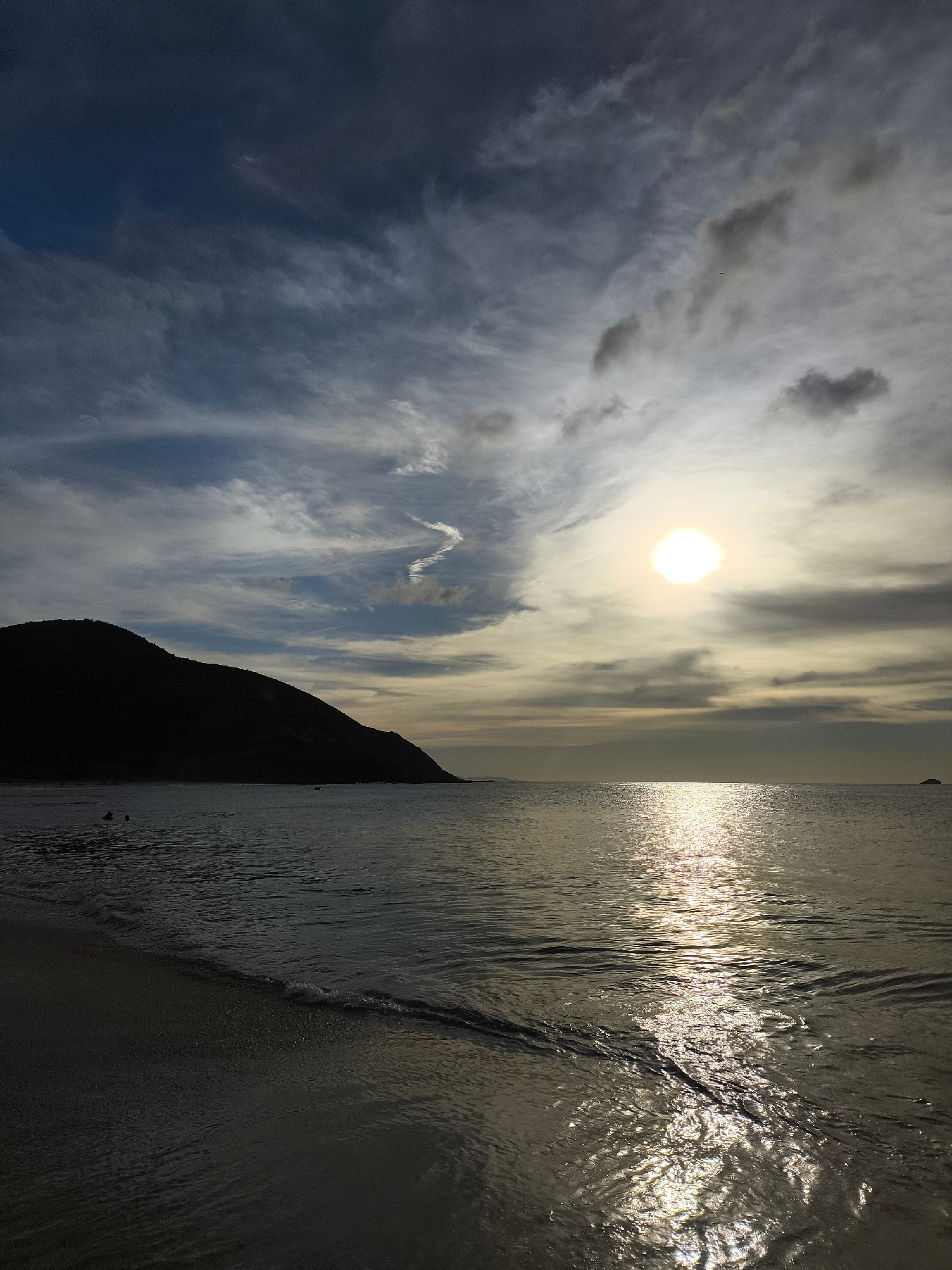 The image depicts a beach scene in Pedro González, Venezuela. The sun is low on the horizon, obscured by a layer of clouds, casting a shimmering reflection across the water's surface. A dark, silhouet…read more