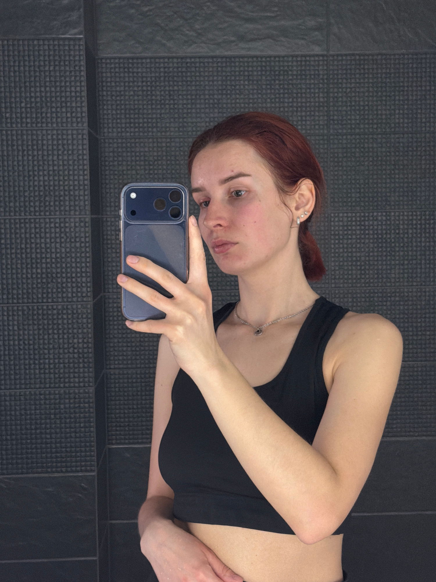 A woman is taking a selfie in what appears to be a bathroom. She is wearing a black sports bra and a silver necklace. Her hair is reddish-brown and pulled back. She is holding a dark-colored smartphon…read more