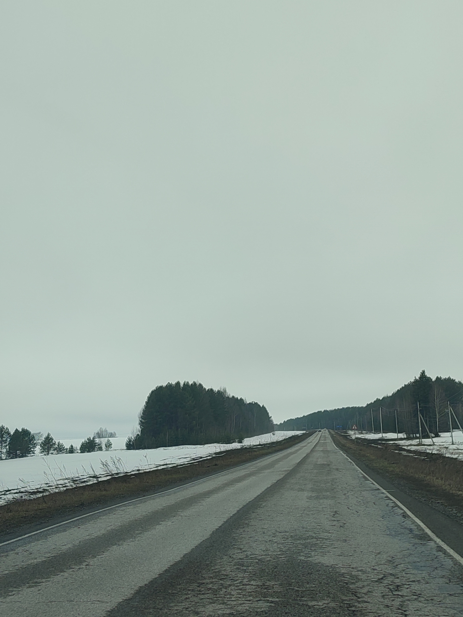 The image depicts a straight, two-lane road stretching into the distance under an overcast sky. The road surface appears wet and worn. Snow is visible on the sides of the road in the adjacent fields a…read more