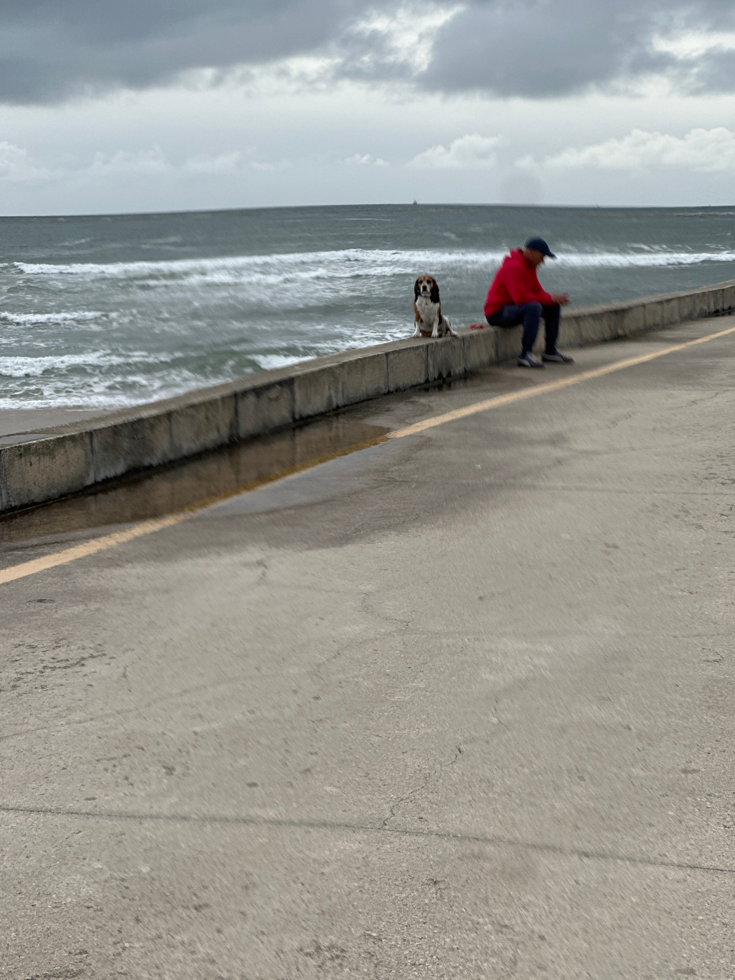 A blurred photograph taken at an angle shows a person and a dog sitting on a sea wall in Gafanha da Nazaré, Portugal. The person, wearing a red jacket and blue cap, is seated with legs dangling over t…read more