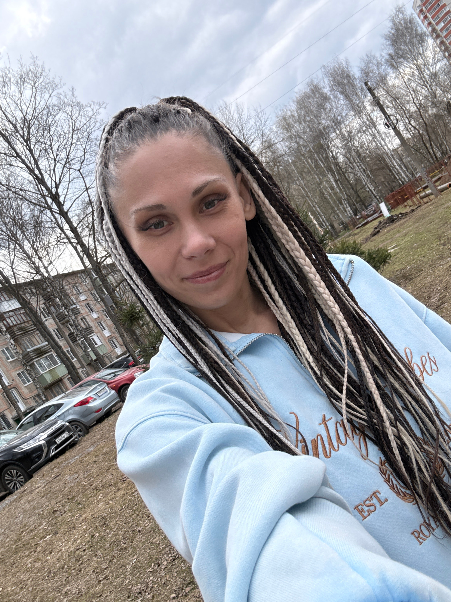 The image shows a woman taking a selfie outdoors in a residential area, likely in Rusanovo, Russia. She is positioned slightly off-center, looking directly at the camera with a calm, subtle smile. Herβ¦read more