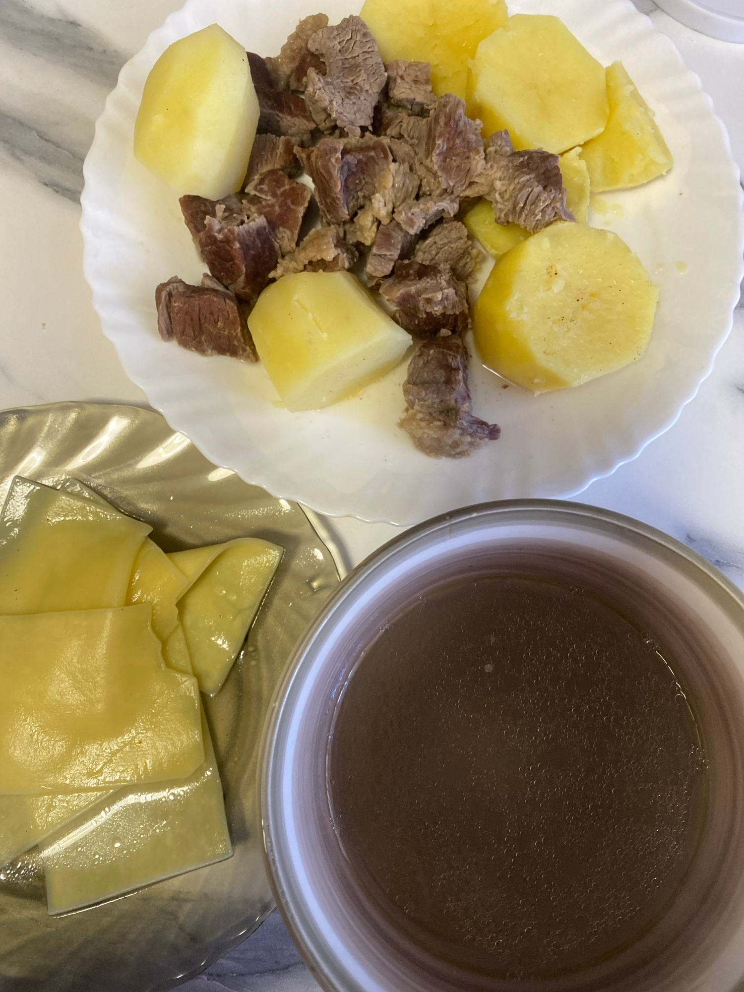 The image depicts a meal consisting of boiled potatoes and cubed beef served on a white plate, a bowl of broth, and what appears to be boiled dough squares served on a textured glass plate. These item…read more