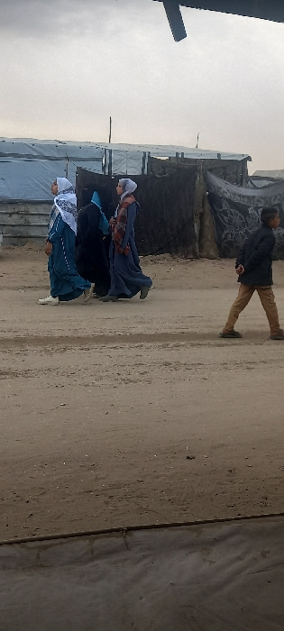 Three women in hijabs and long dresses walk down a dirt path next to makeshift tent structures. A man wearing a coat and pants walks away from them in the opposite direction. The sky appears cloudy an…read more