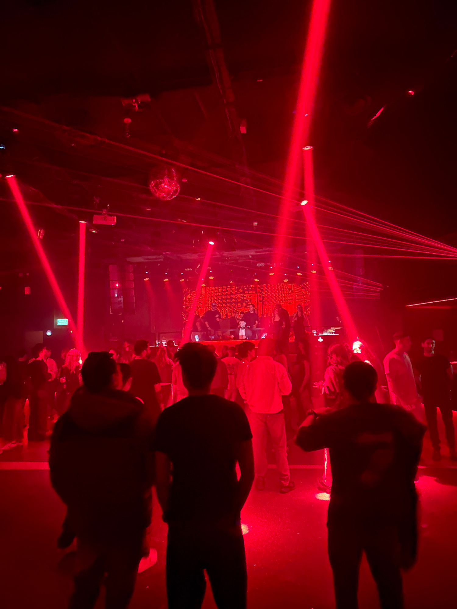 The image shows a crowded nightclub in what is likely Barcelona, Spain, indicated by an external sign. The scene is dimly lit, with a prominent red laser light display illuminating the space. There arβ¦read more