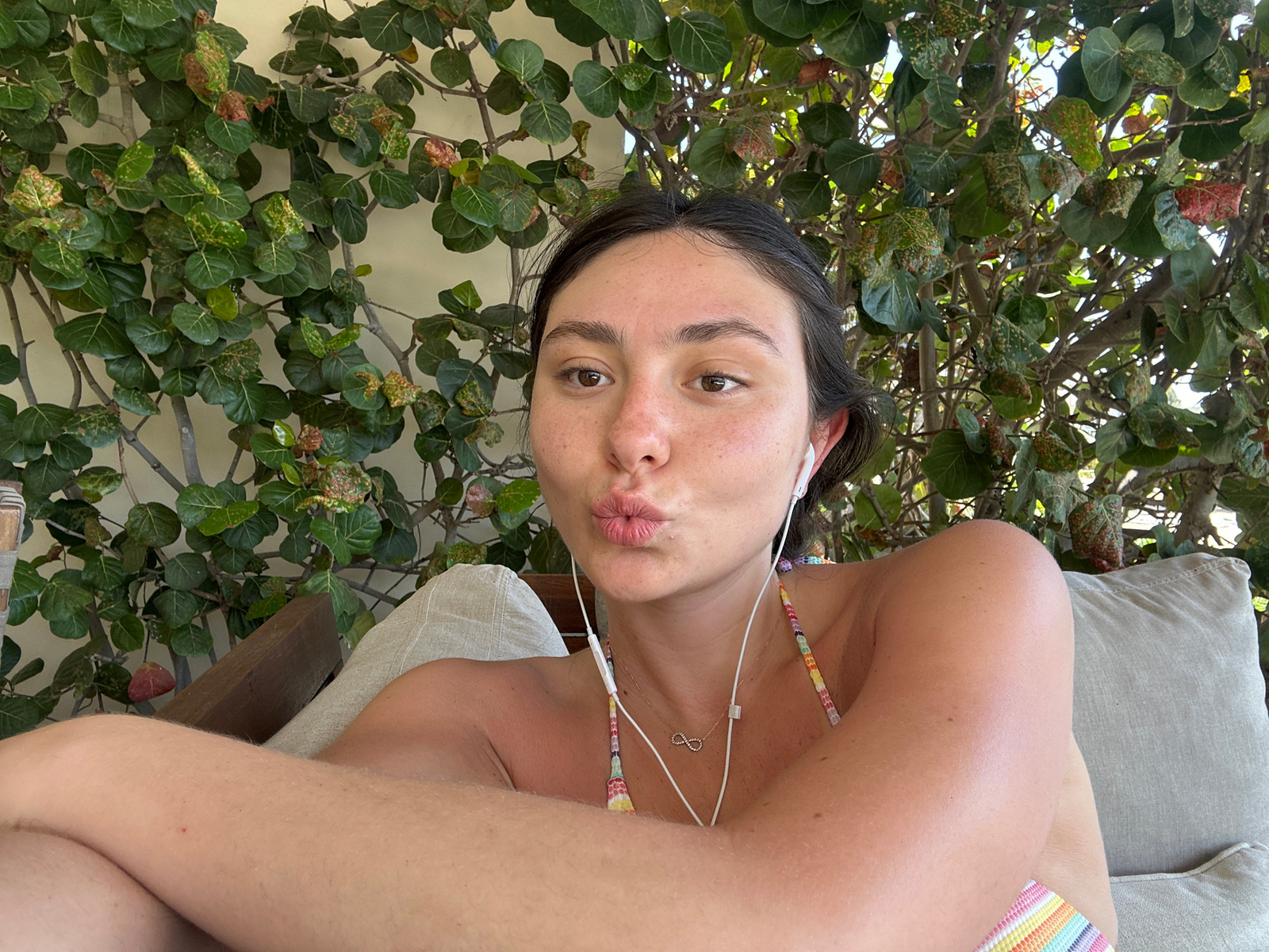 An image captured in Playa Blanca, Mexico, depicts a young adult female seated outdoors. The subject has fair skin, dark hair, and brown eyes, with visible freckles on her face. She is wearing a multi…read more
