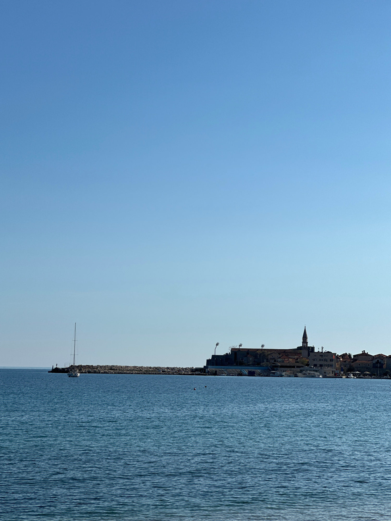 The image shows a view of the city of Budva, Montenegro, from the sea. The sky is clear and blue, and the water is calm. The cityscape is visible in the background, with the distinctive spire of the C…read more