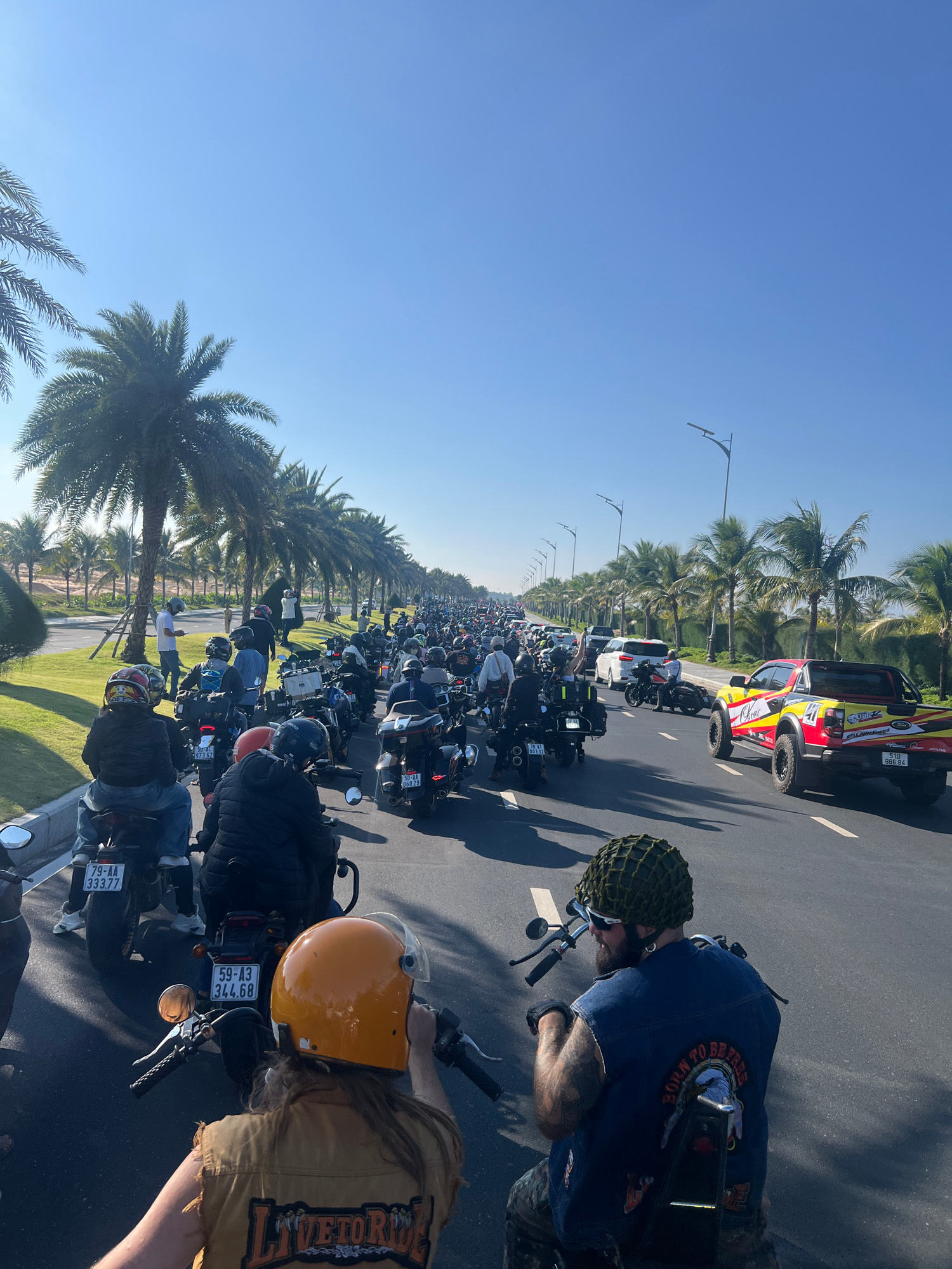 A large motorcycle convoy is depicted moving along a multi-lane asphalt road in Cam Ranh, Vietnam, under a clear, cloudless blue sky. The road is bordered by groomed green grass verges and numerous ma…read more