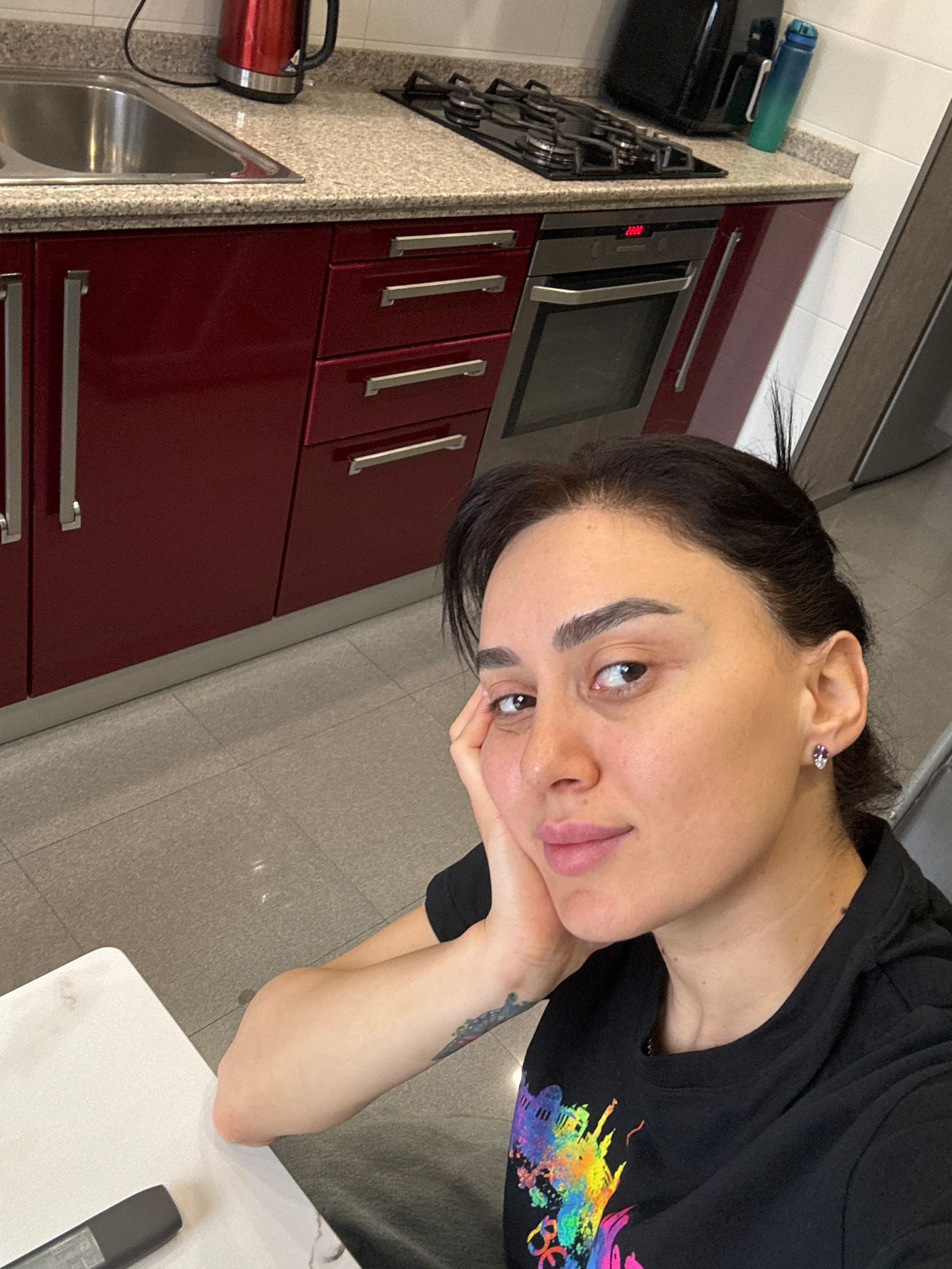 A woman is posing for a selfie in a kitchen. She is wearing a black t-shirt with a colorful design. Her hair is dark and pulled back. She has an earring in her left ear and a tattoo on her left forear…read more