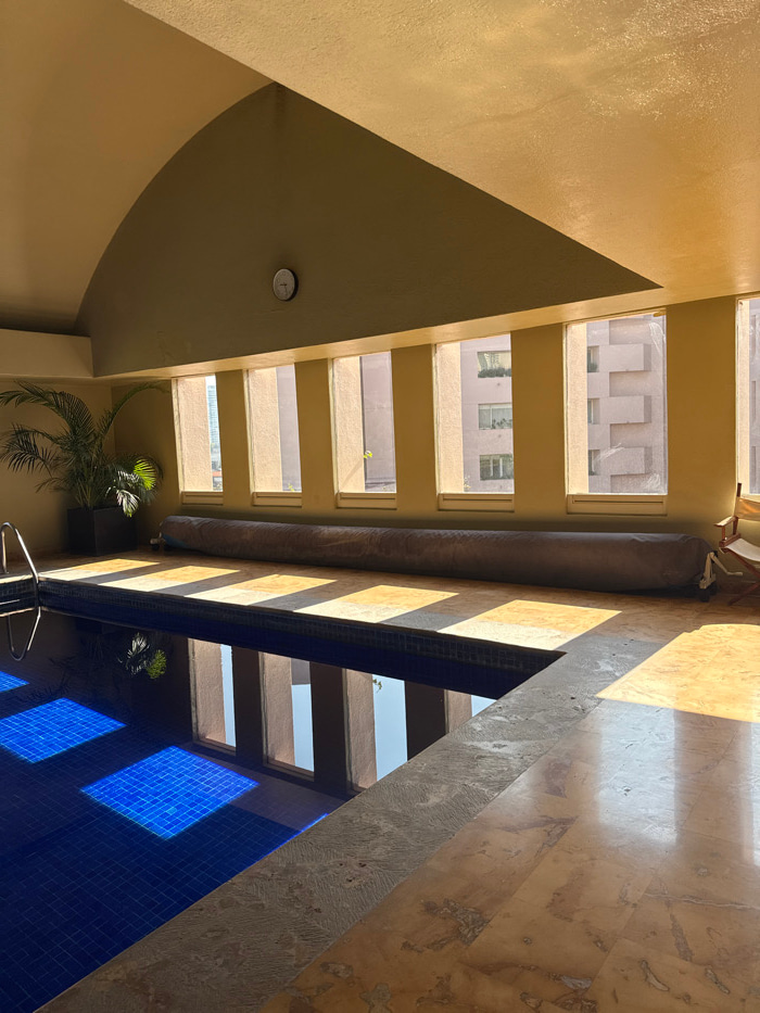 An indoor swimming pool facility in an urban area of Mexico City, Mexico, is depicted under natural light. The scene focuses on a rectangular dark blue tiled swimming pool, featuring a silver metallic…read more