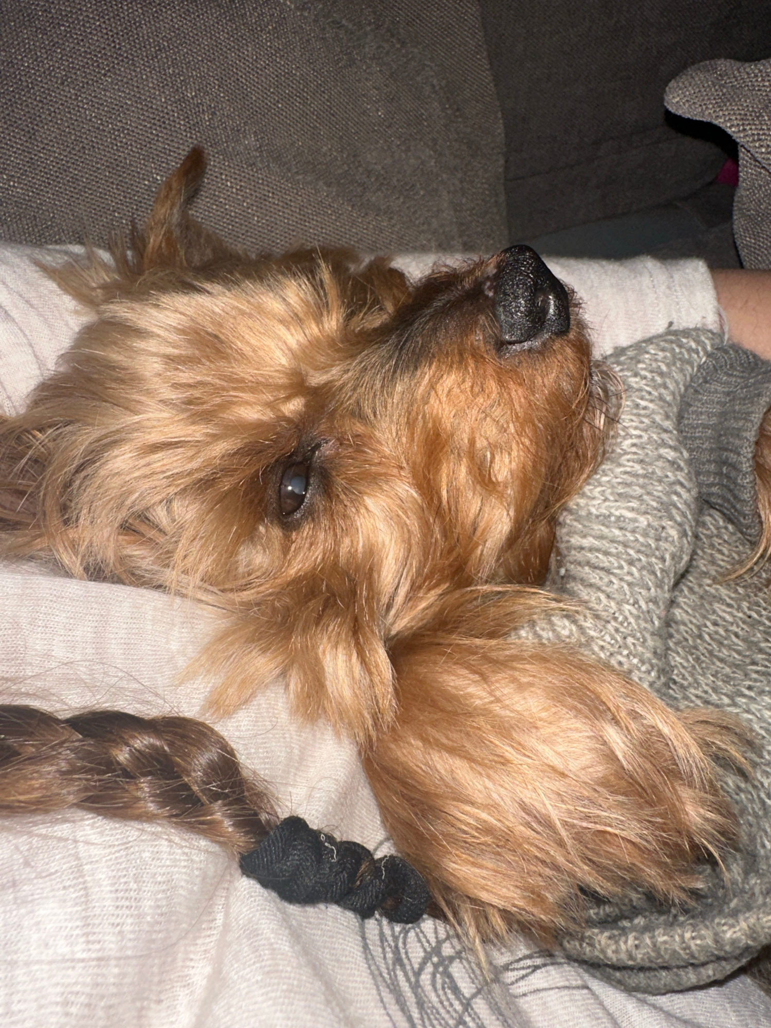 A tan Yorkshire Terrier dog is lying on a light-colored textured fabric, possibly a blanket or clothing. The dog's head is positioned at the top of the frame, with its black nose pointing upwards. Its…read more