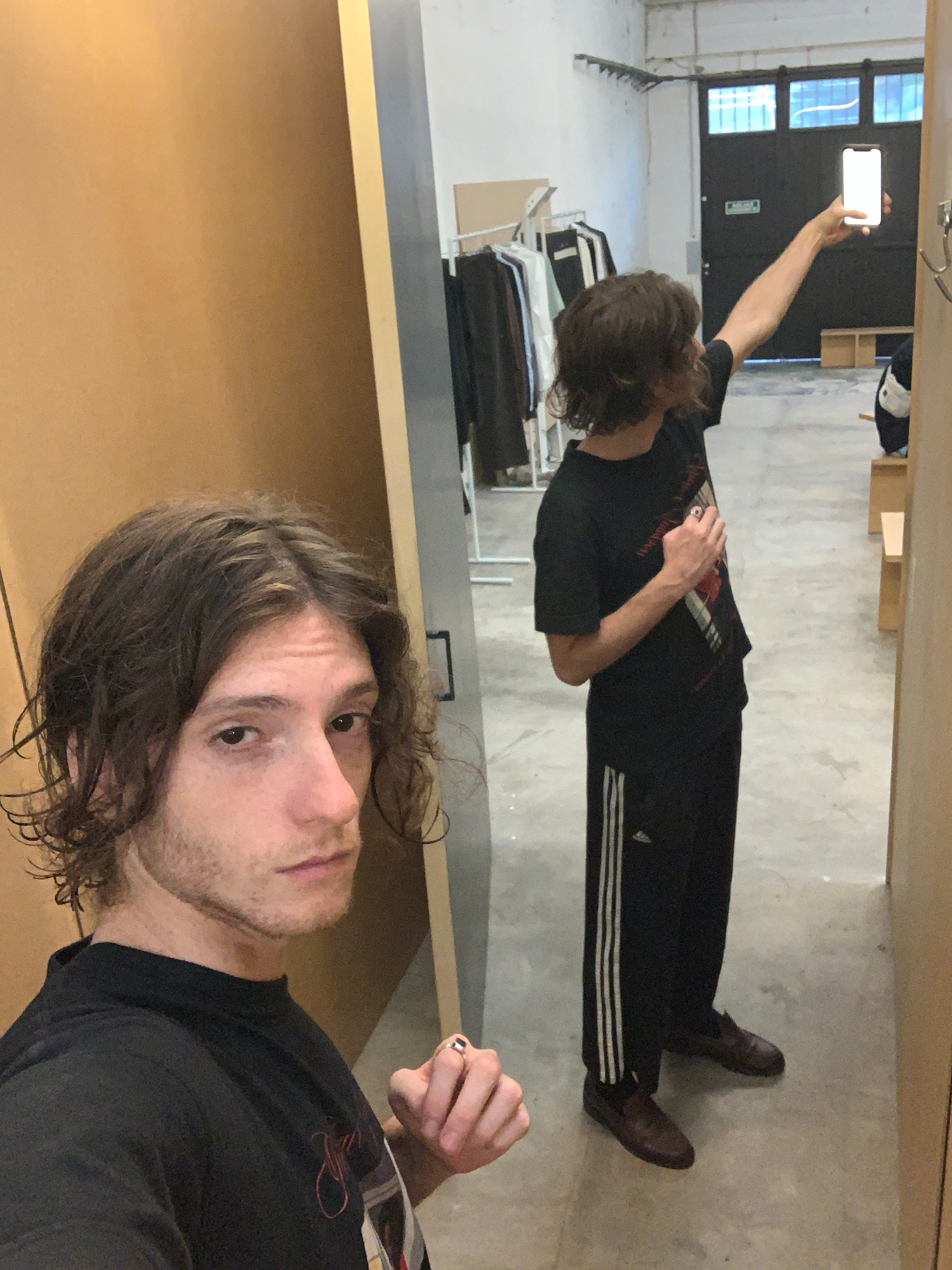 A selfie-style photograph, taken indoors, features two young men. In the foreground, a man with medium-length wavy brown hair and light stubble looks directly at the camera with a neutral expression.…read more