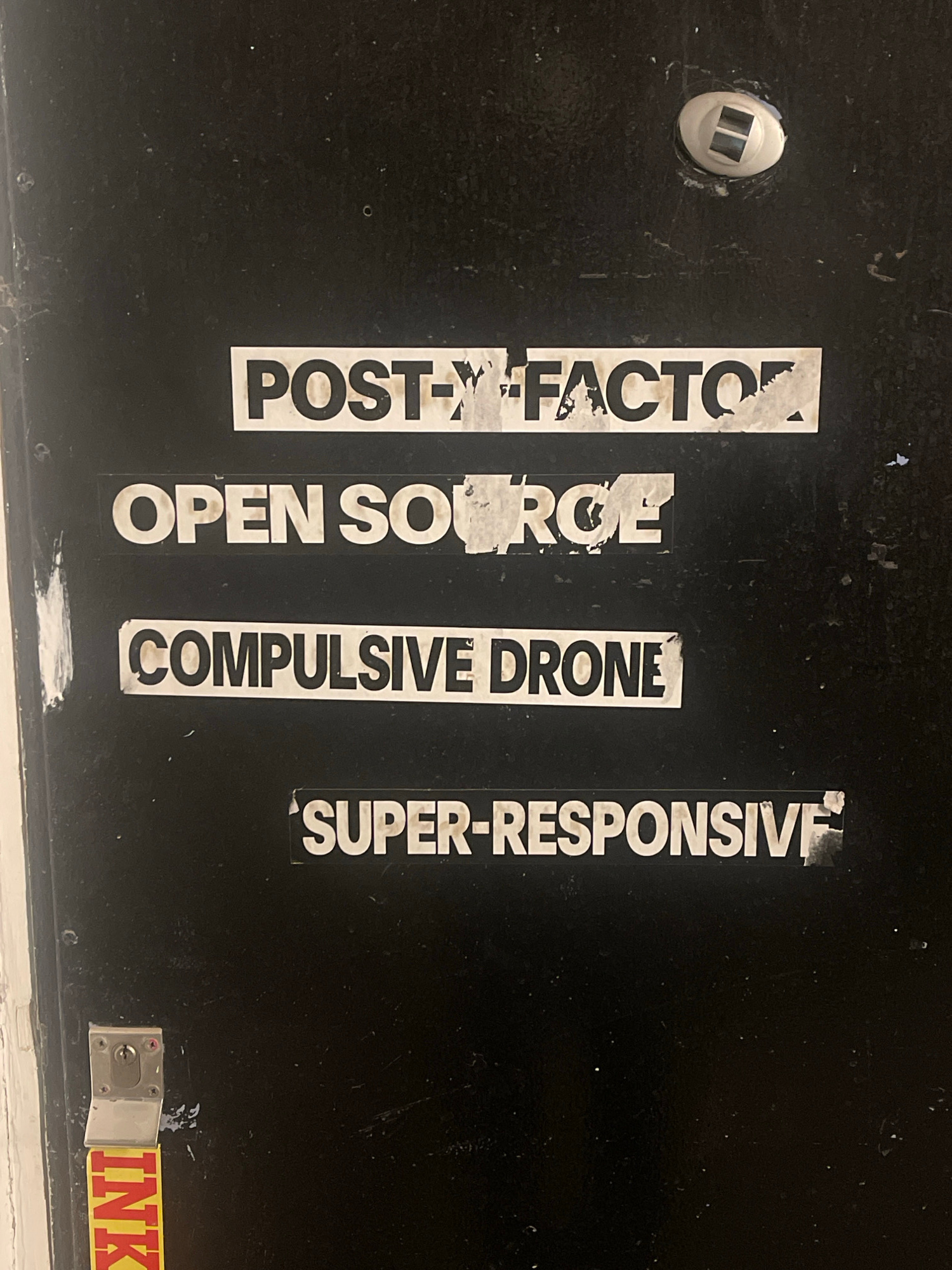 The image shows a black surface with four vertical stickers in white lettering. From left to right, the stickers read: "POST-> FACTOR," "OPEN SOURCE," "COMPULSIVE DRONE," and "SUPER-RESPONSIVE." The s…read more