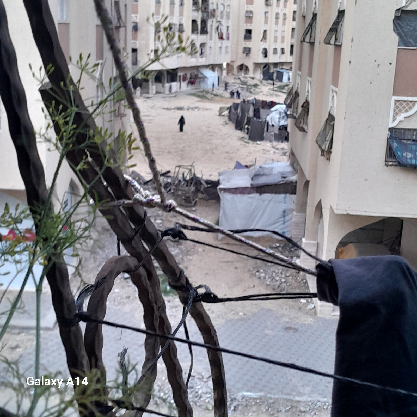 The image provides an elevated view of a sandy/dirt courtyard surrounded by residential buildings in Khan Yunis, Palestinian Territory. In the immediate foreground, dark, gnarled branches and green fo…read more