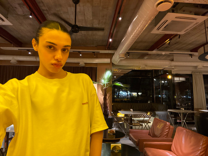 An individual with dark hair pulled back, wearing a bright yellow short-sleeved t-shirt with a small dark inscription on the left chest, is depicted in a selfie taken indoors at night. The person is p…read more