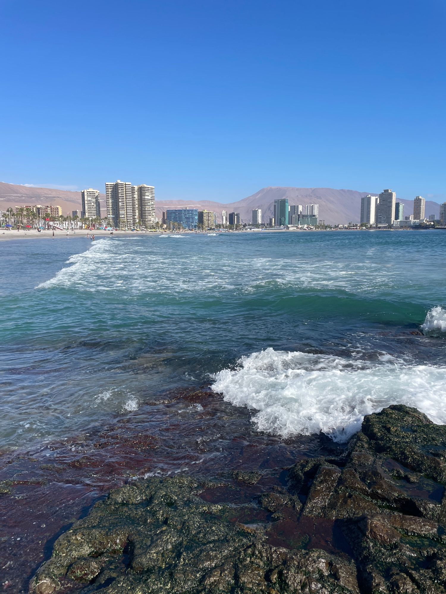 The image shows a coastal view in Iquique, Chile, on a clear day. In the distance, tall buildings line the shore, backed by a mountain range. The foreground features the ocean with waves crashing agai…read more