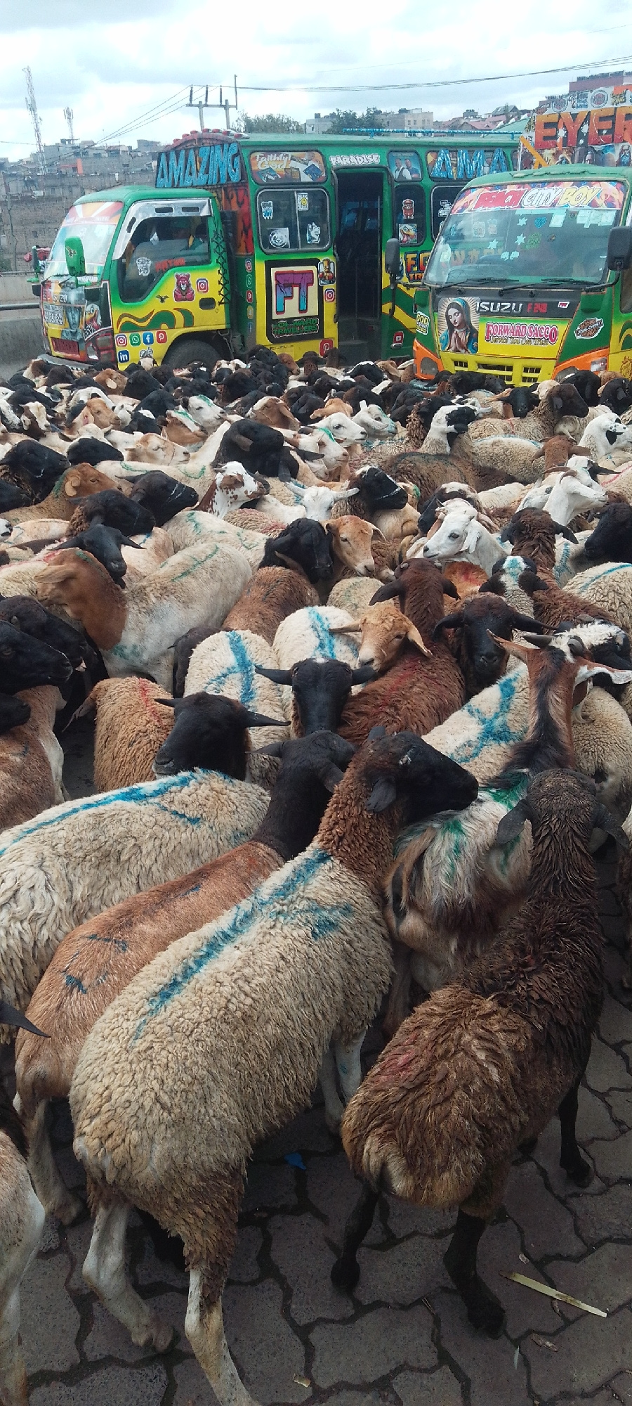 The image shows a large flock of sheep crowded together in a paved area. Several green and yellow painted minibuses, common in Nairobi, Kenya, are positioned near the flock. The buses are brightly dec…read more