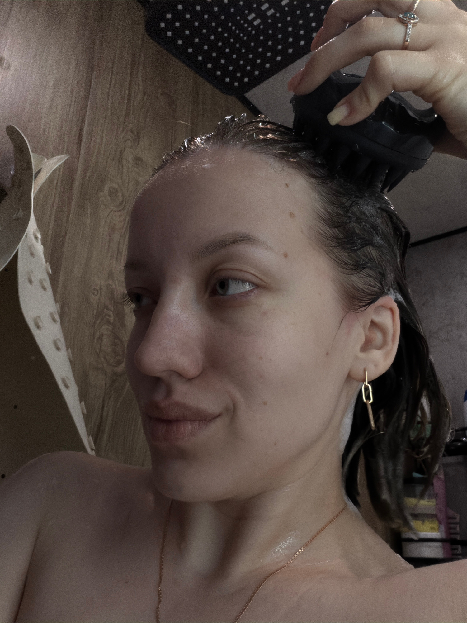 A person with wet, dark hair is using a black hair brush. They have fair skin, blue eyes, and a gold chain necklace. They are wearing a gold earring. The setting appears to be a bathroom with wooden-l…read more