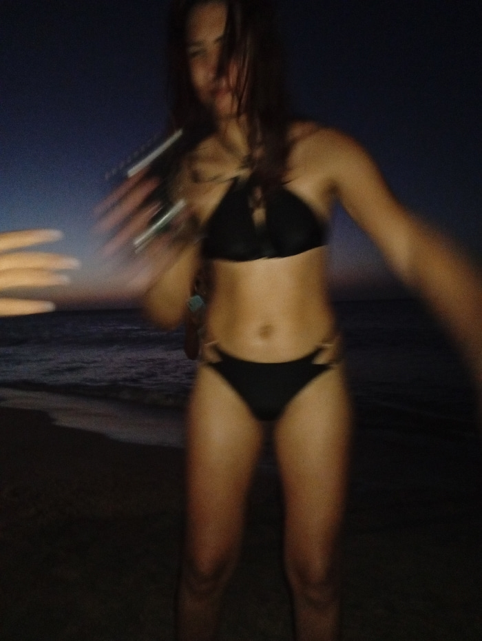 A woman in a black bikini stands on a beach at night. The ocean is visible in the background with a dark blue sky above. She is slightly out of focus, with motion blur suggesting movement. A blurred h…read more