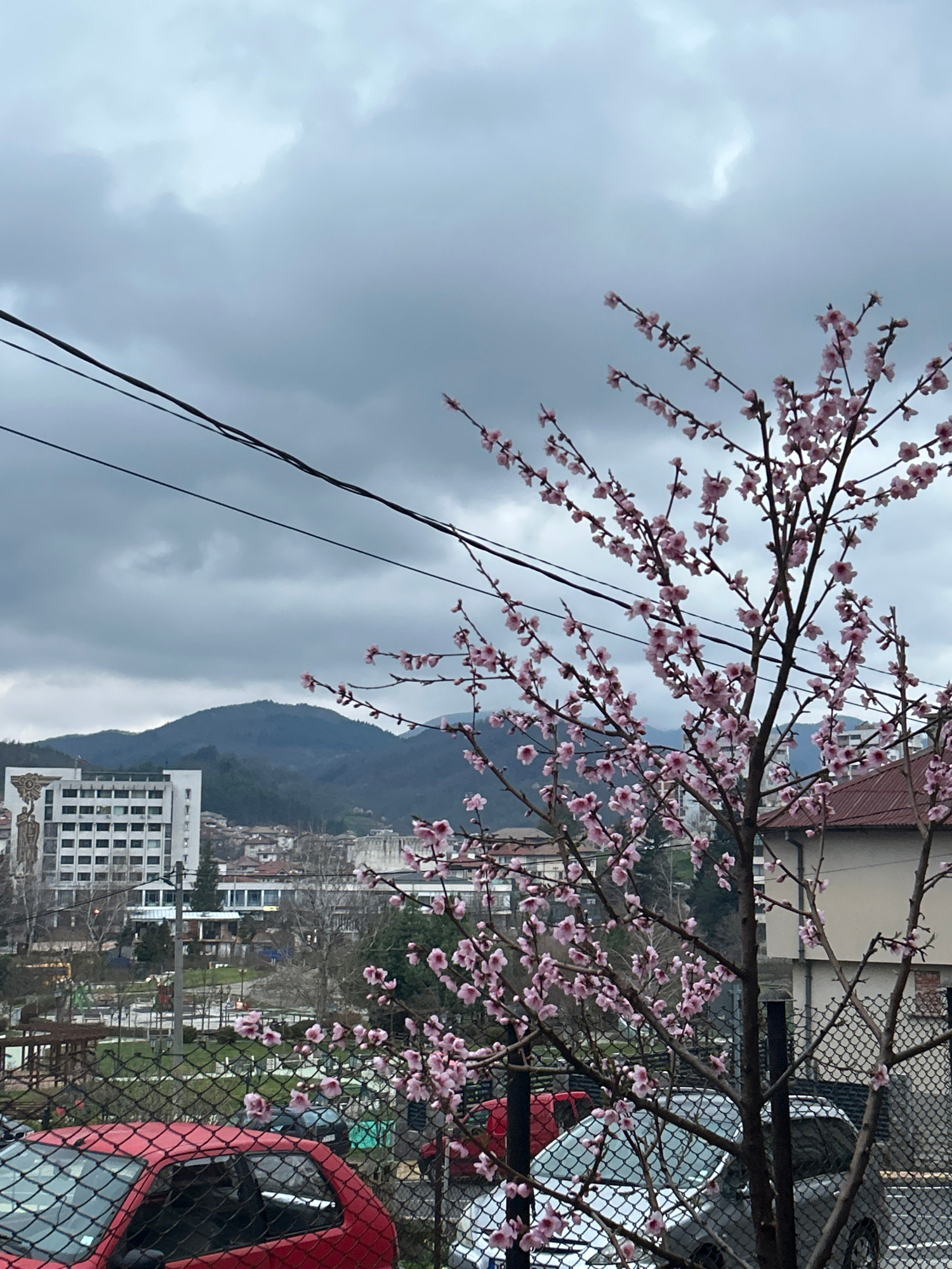 The image depicts a cityscape of Zlatograd, Bulgaria, under a cloudy sky. A tree with pink blossoms is prominently featured in the foreground, partially obscuring the view. Behind the tree, a mountain…read more