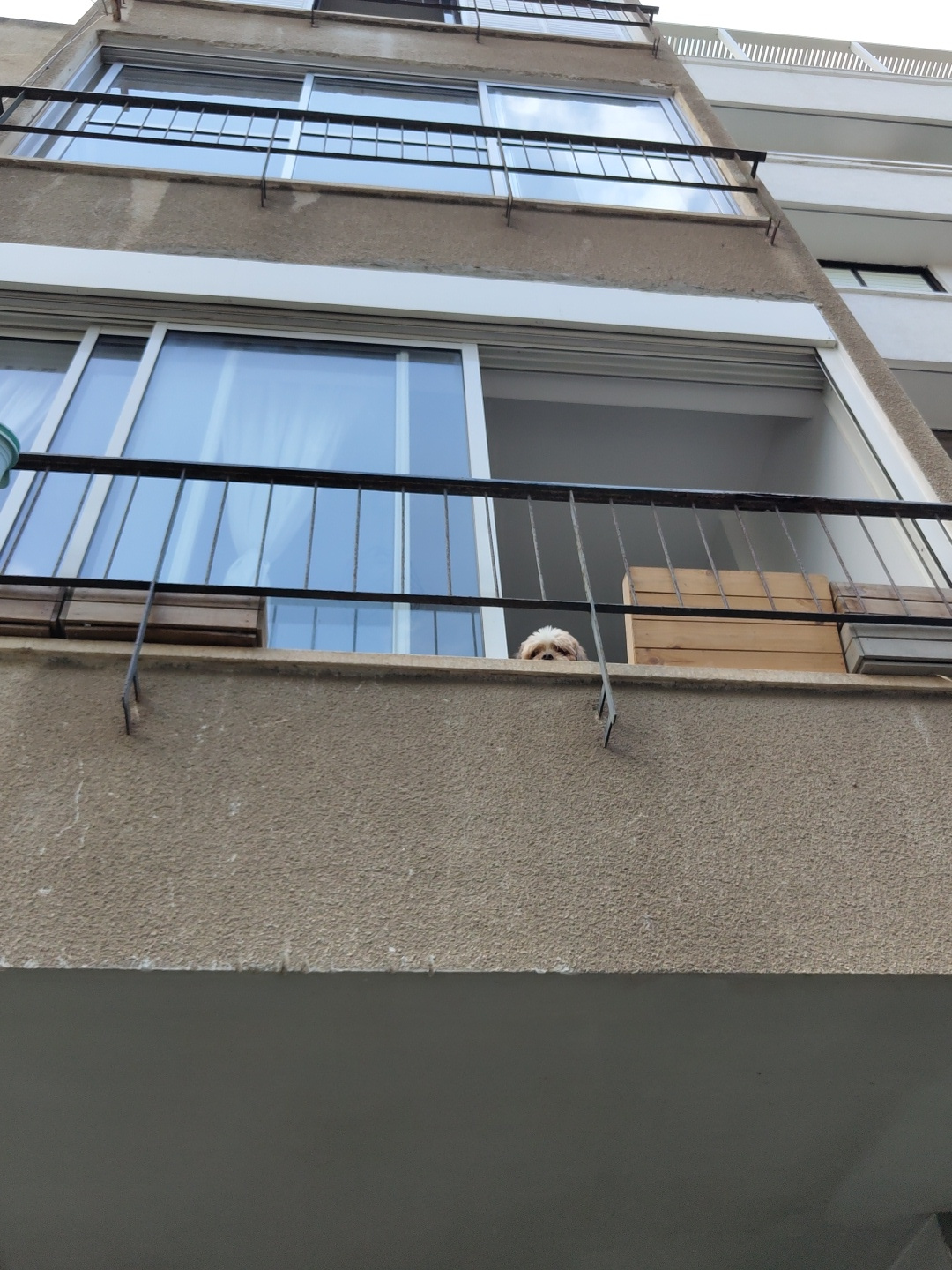The image is an exterior shot of an apartment building, likely located in Tel-Aviv, Israel. The building has a beige textured exterior with multiple windows protected by black metal bars. The windows…read more