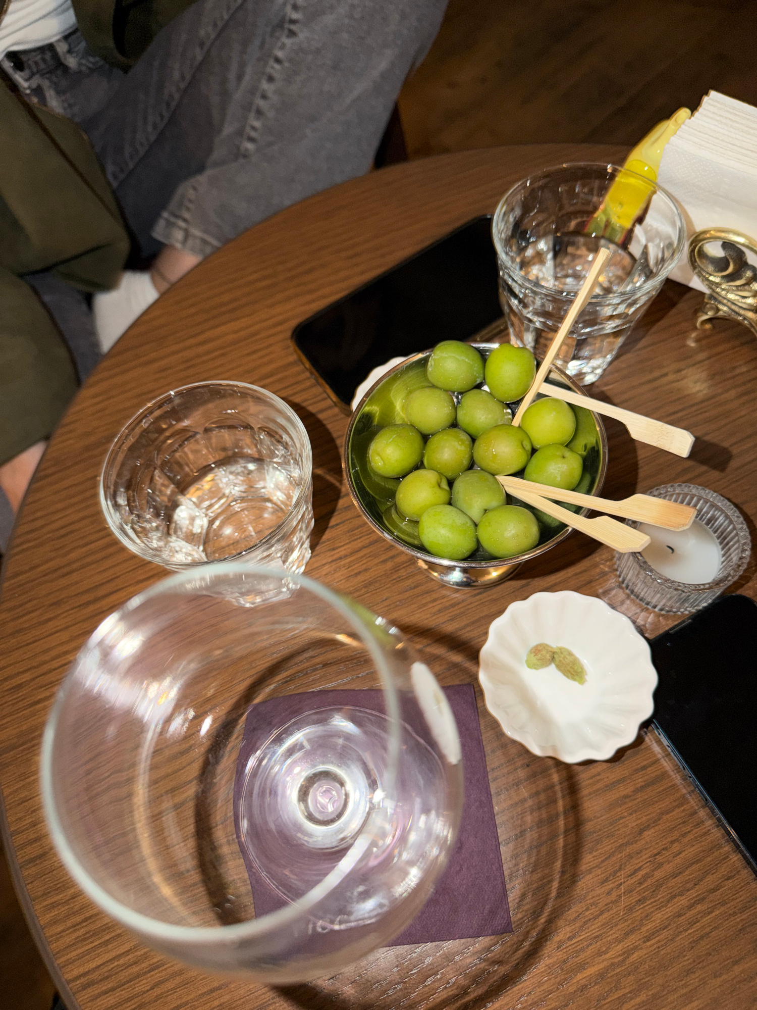 A high-angle shot captures a table in Yerevan, Armenia, featuring culinary and bar items. Central to the composition is a silver bowl filled with green olives, skewered with multiple wooden toothpicks…read more