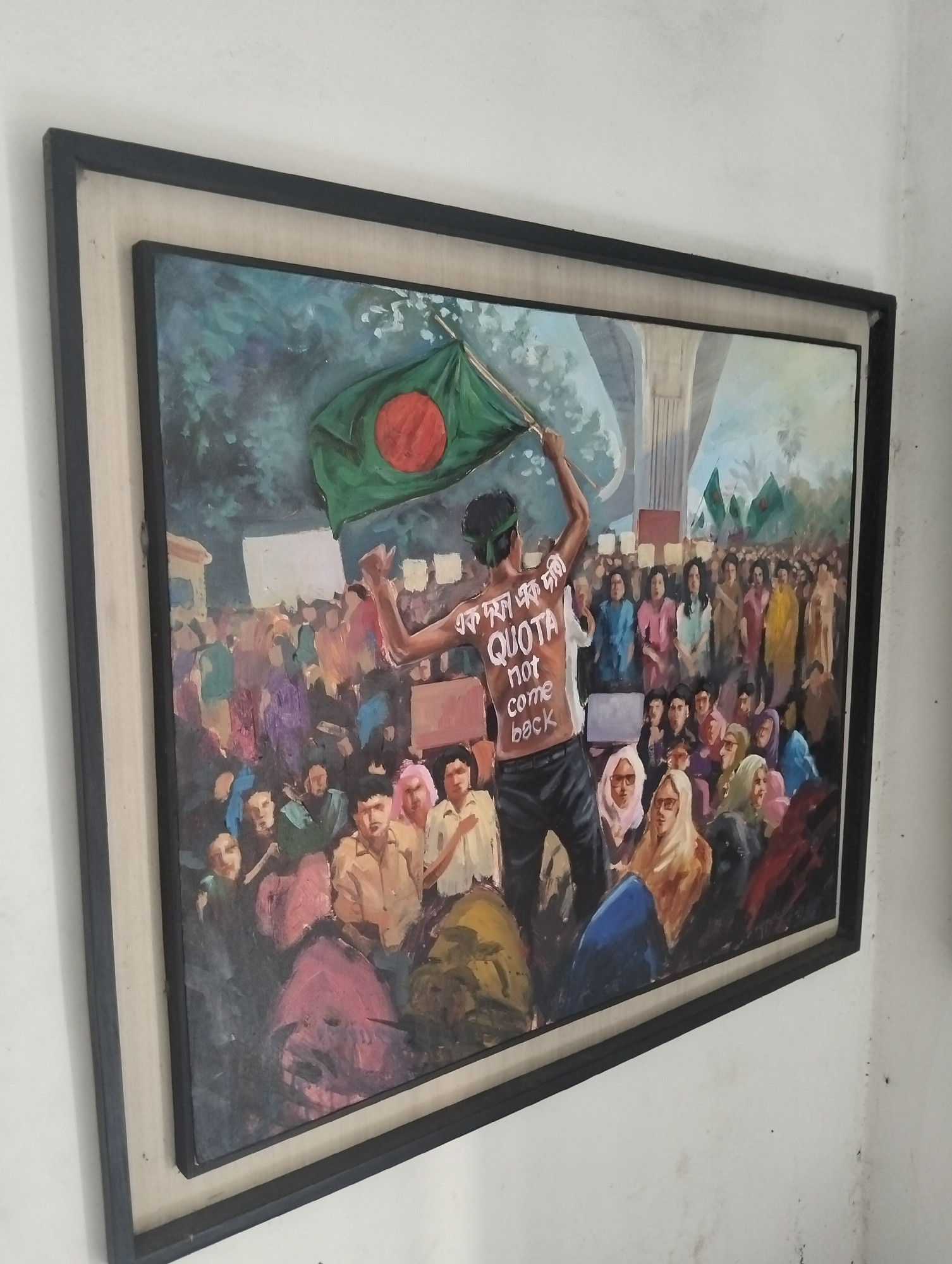 The image shows a framed painting hanging on a white wall. The painting depicts a protest in Dhaka, Bangladesh, with a crowd of people holding signs and the Bangladeshi flag. At the center of the pain…read more